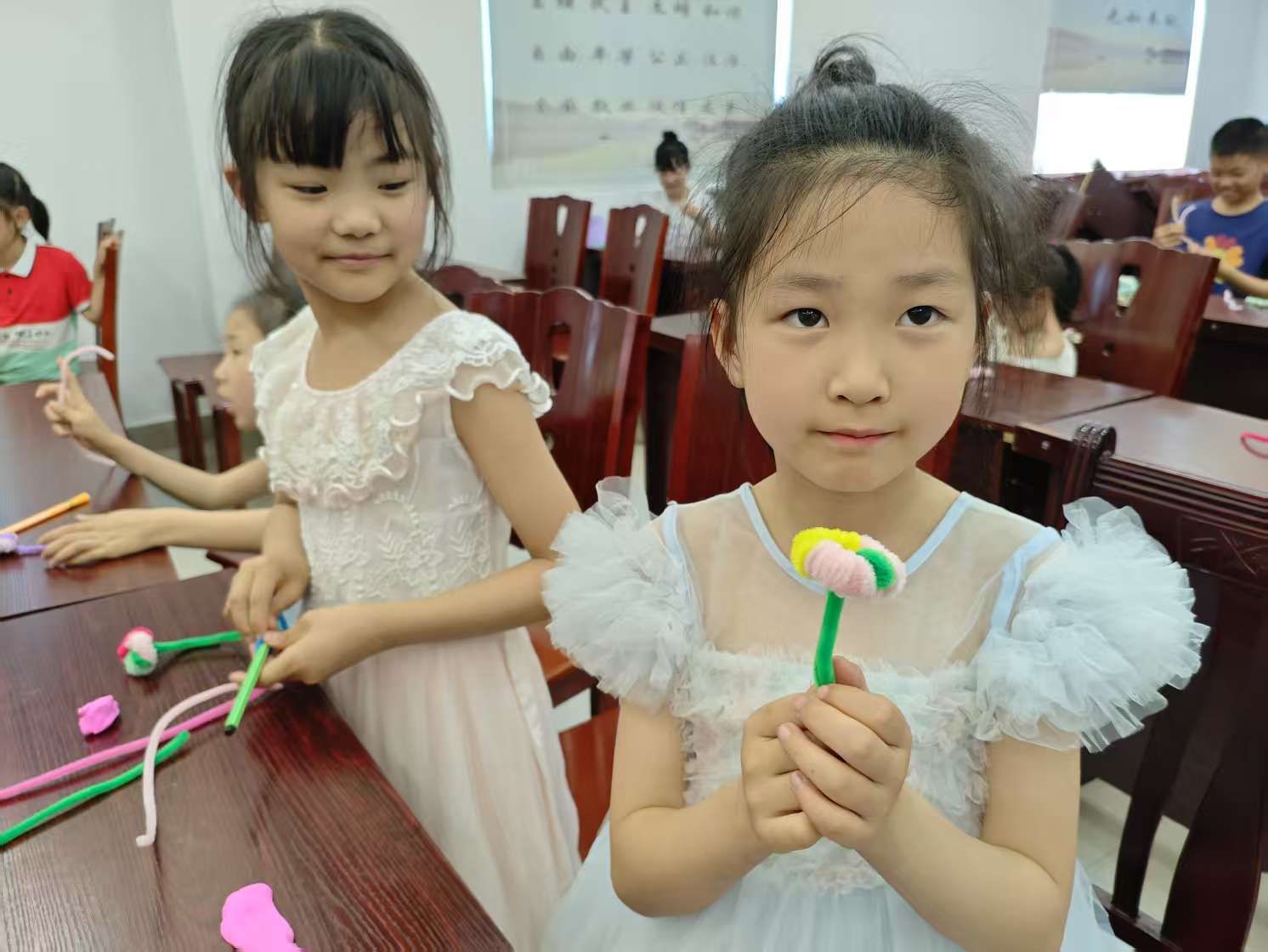 教室里,灵巧的小手与彩色的扭扭棒共舞。一名男孩反复调试自制的“机械手臂”,试图让关节灵活摆动;几个女孩合作编织的“星空花环”渐成雏形,每片花瓣的弧度都经过精心设计;角落的小组则埋头研究“旋转木马”的平衡结构,桌上散落的草稿纸记录着稚嫩却认真的思考痕迹。志愿者们穿梭其间,时而俯身指导缠绕技巧,时而用光影为作品增添奇幻效果。阳光透过窗户洒在课桌上,折射出斑斓的光晕,整个空间仿佛被注入魔法,每一件半成品都闪烁着童真的光芒。