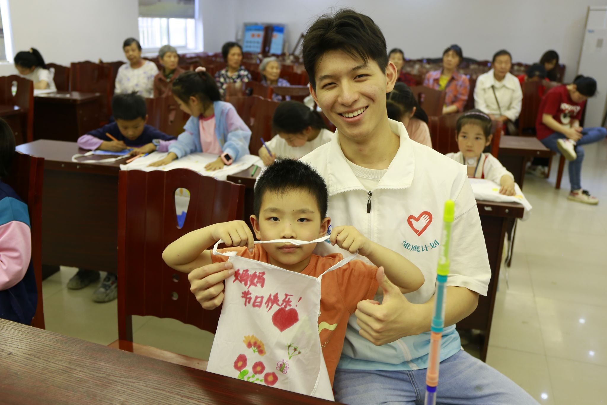 "教育不仅是知识的传递,更是情感的培育。""雏鹰计划"负责人表示,此次活动通过艺术创作唤醒孩子们的情感表达力,让感恩教育浸润童心。活动尾声,志愿者们协助孩子们将围裙精心包装,并叮嘱他们"回家给妈妈一个拥抱"。