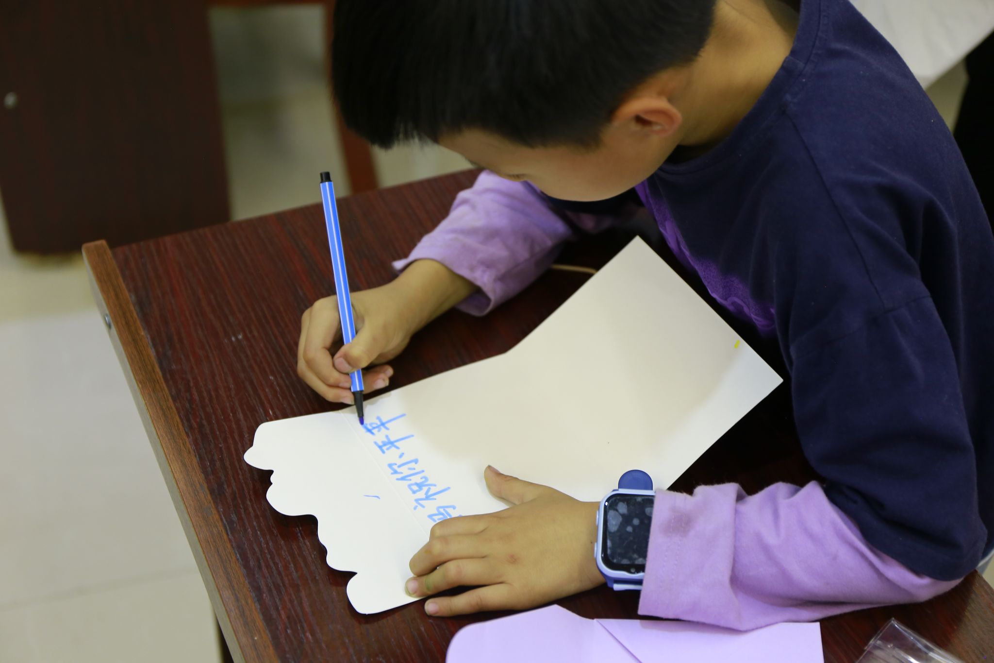 活动过程中,孩子们化身"小小艺术家",或趴或坐,专注地涂抹色彩。志愿者们在旁轻声指导,帮助调配颜料、勾勒线条,更鼓励孩子们用图案表达心声。一方方围裙逐渐被童趣填满,爱意跃然布上。活动现场洋溢着温馨与欢笑。一位小朋友一边画画一边说:"妈妈总说她不需要礼物,但我要把这条围裙藏到周末,给她一个大惊喜!"志愿者还准备了贺卡,教孩子们写下对母亲的祝福。孩子们羞涩的笑容里藏着满满的期待。