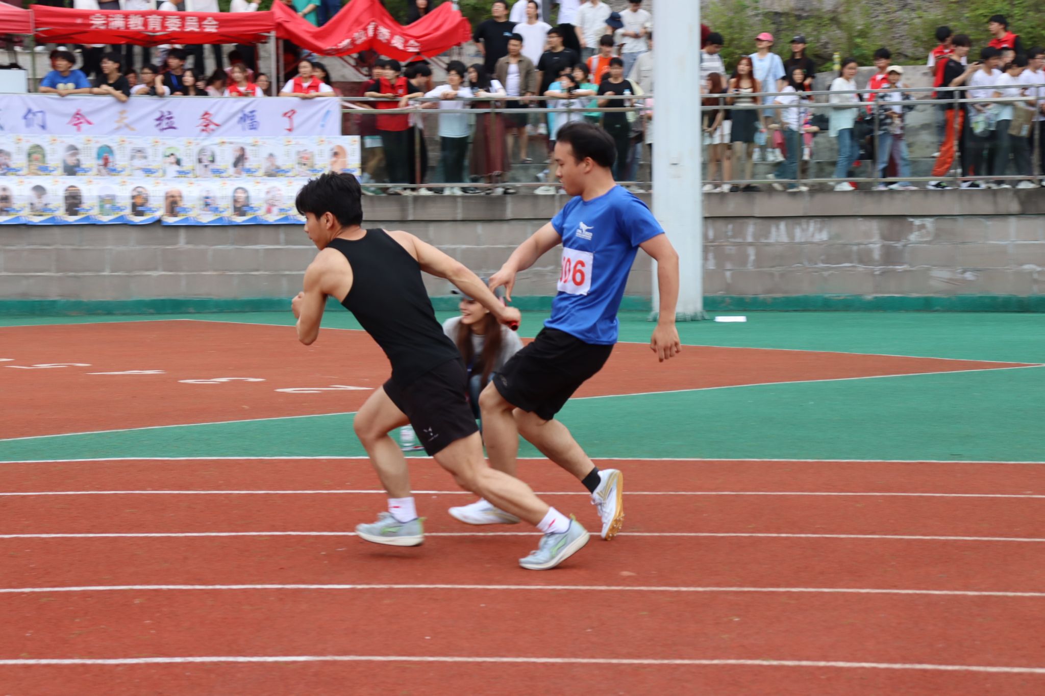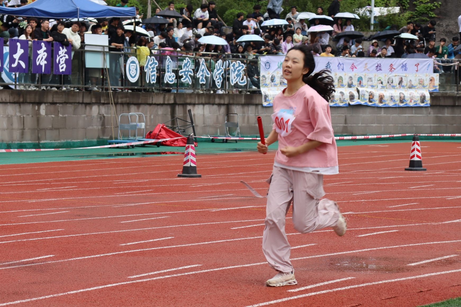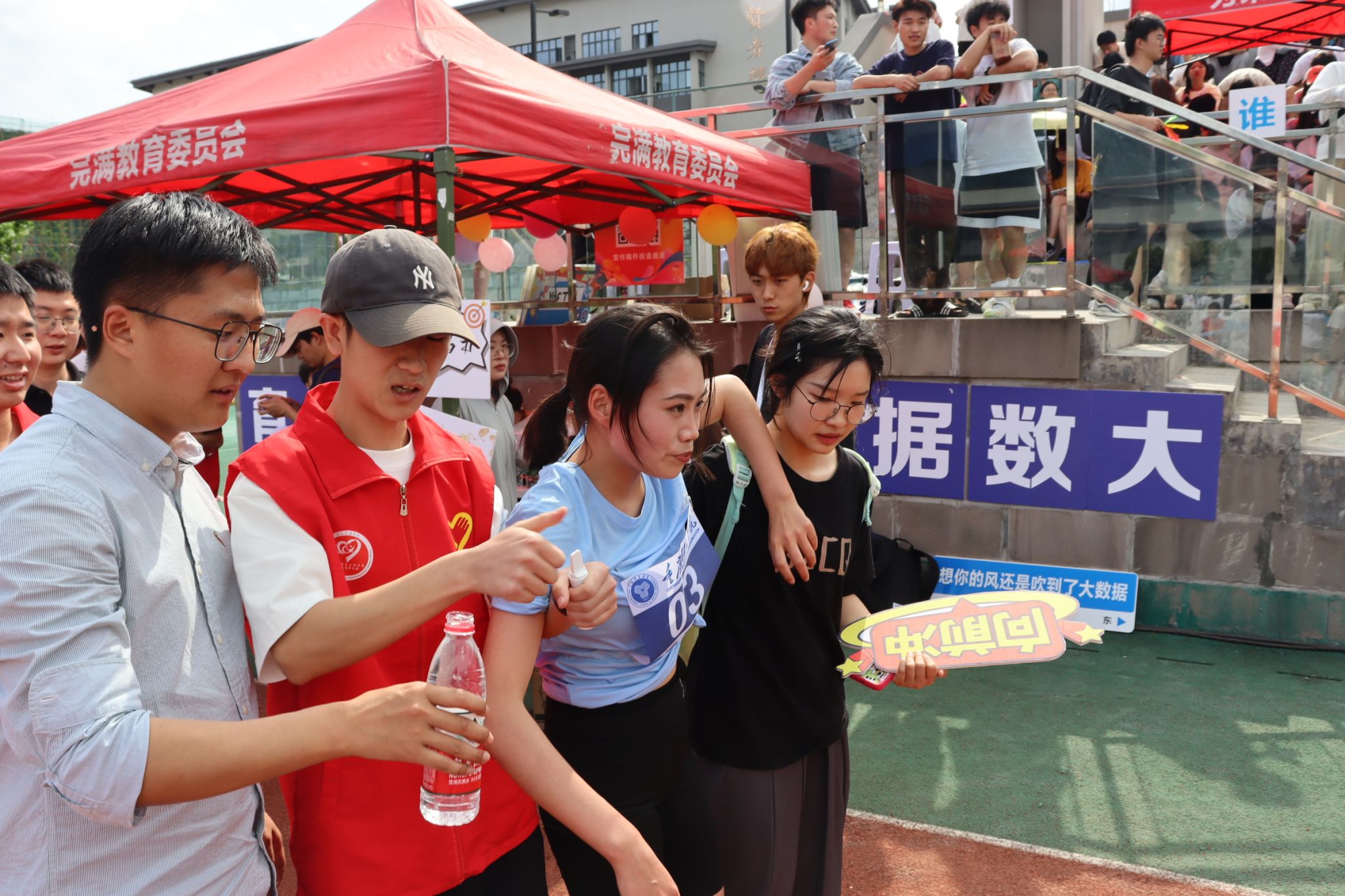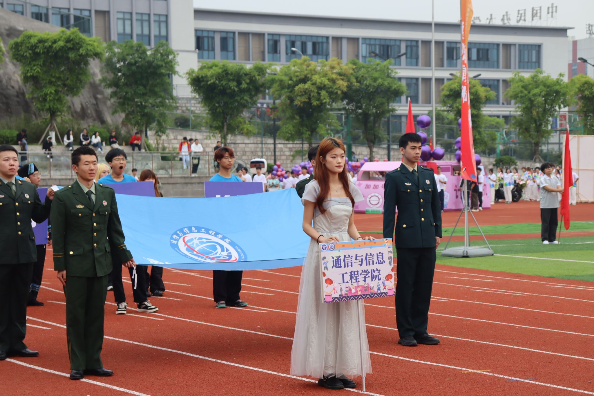 现场气氛热烈,通信学子们激动不已。无论是看台上、观众席还是运动员通道,大家都为即将到来的比赛做好了准备。他们的脸上洋溢着期待和紧张,手里紧握着为我院选手加油的旗帜,或激动地挥舞着手臂,为运动员加油打气。他们希望自己的加油声能给予运动健儿们动力和信心,助他们一臂之力。在运动场上的每一个角落,都能看到志愿者们挥动着旗帜,指挥着跑道上的秩序,为我们的运动员保驾护航。