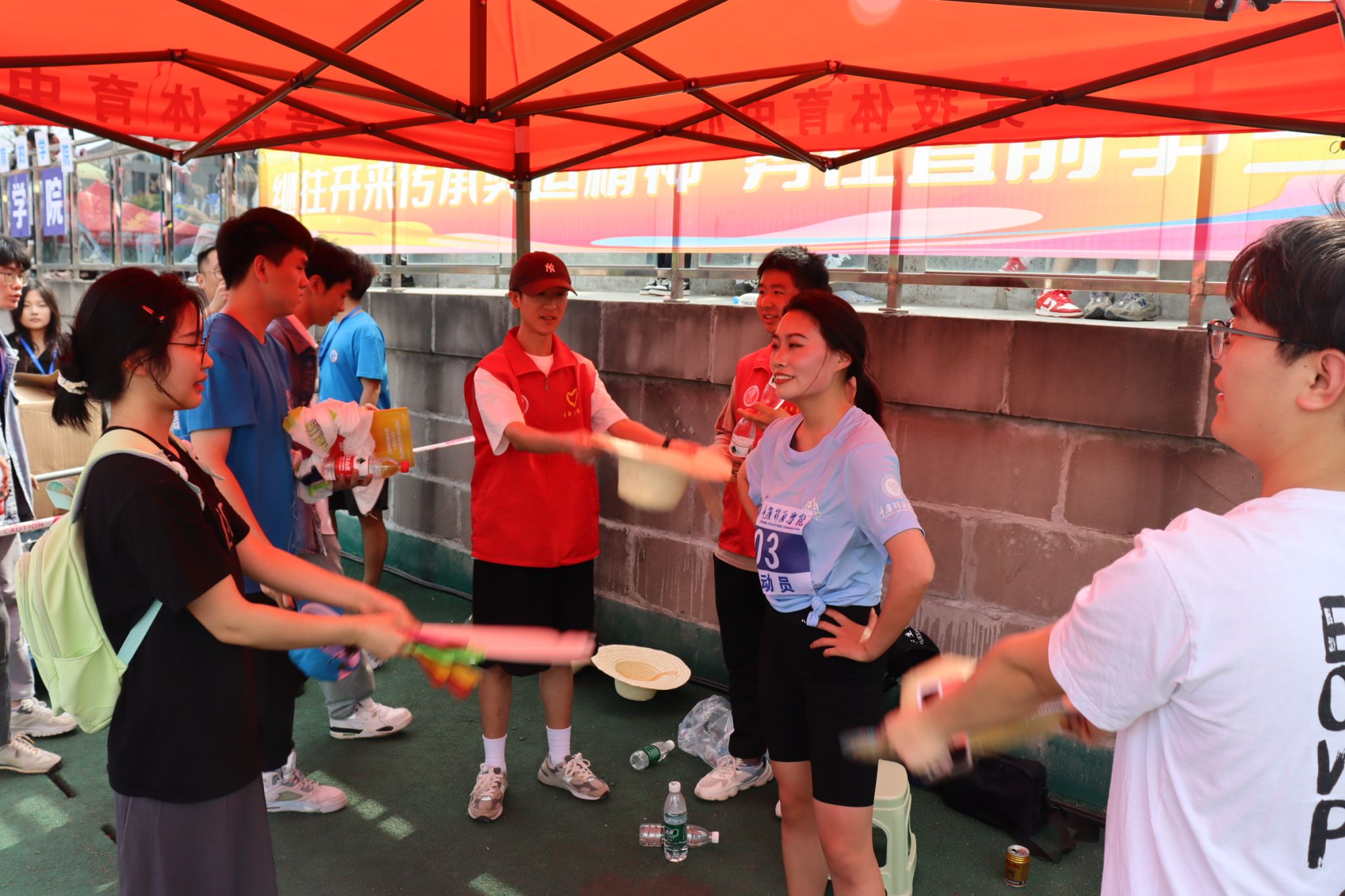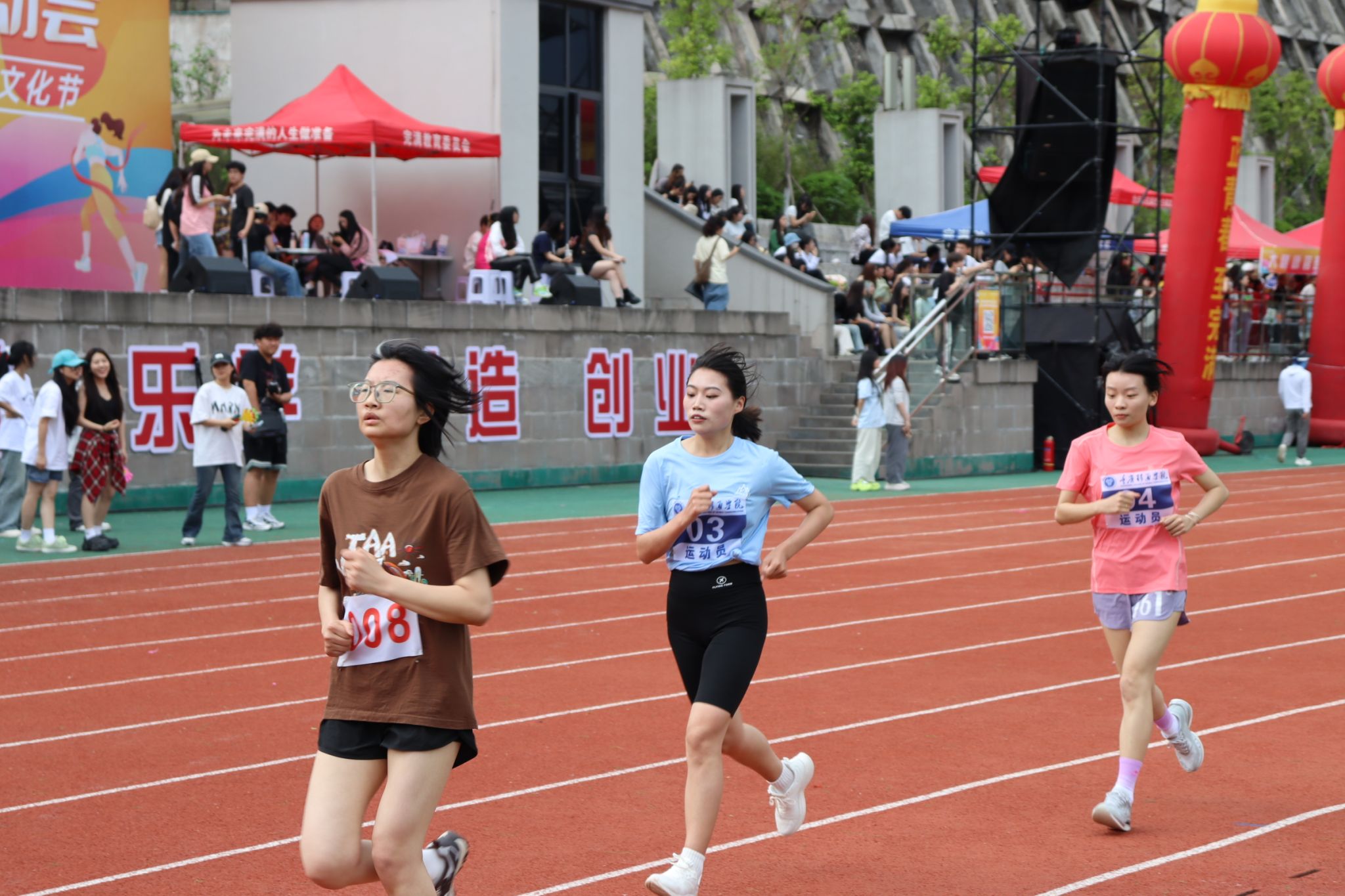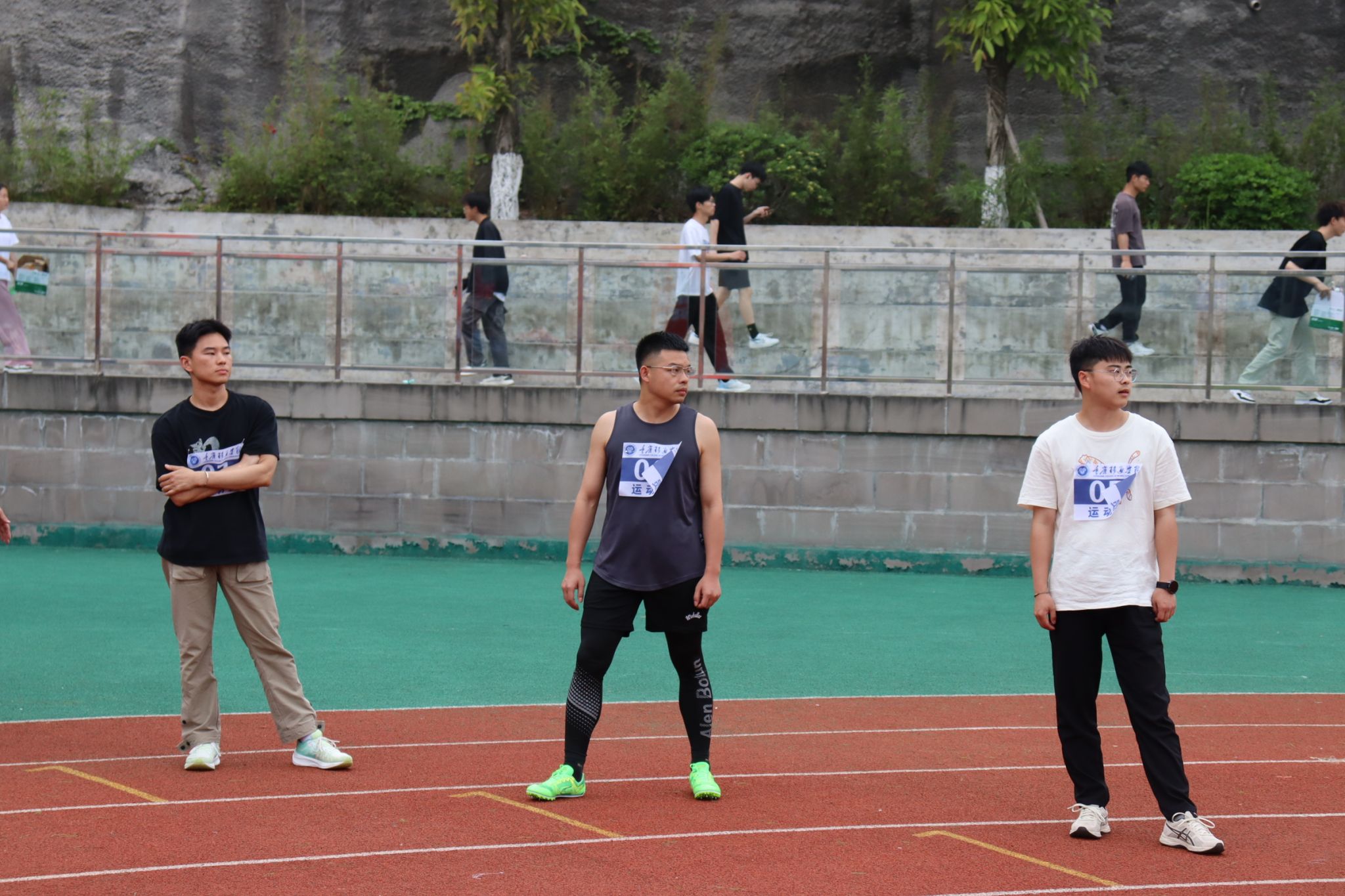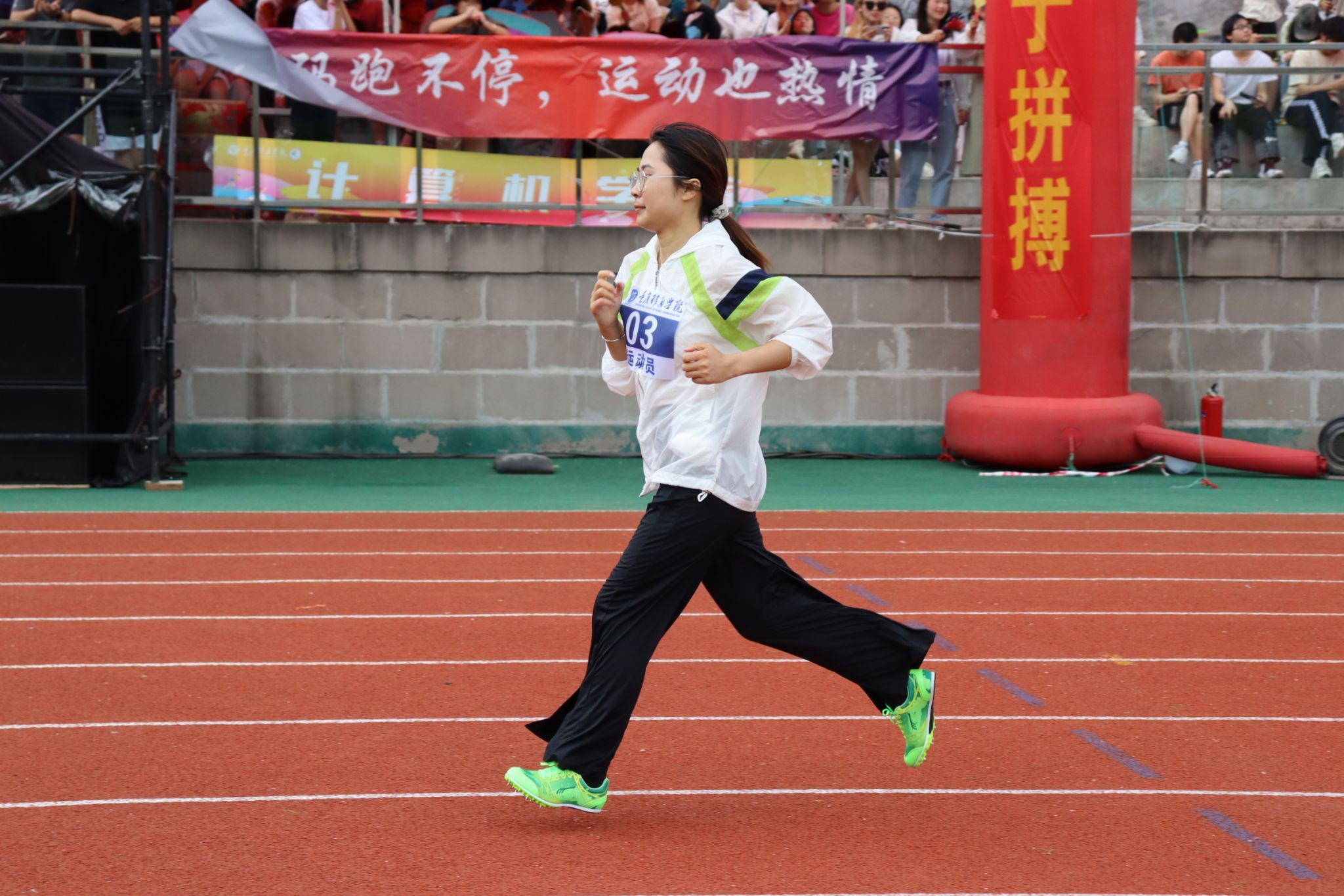 现场气氛热烈,通信学子们激动不已。无论是看台上、观众席还是运动员通道,大家都为即将到来的比赛做好了准备。他们的脸上洋溢着期待和紧张,手里紧握着为我院选手加油的旗帜,或激动地挥舞着手臂,为运动员加油打气。他们希望自己的加油声能给予运动健儿们动力和信心,助他们一臂之力。在运动场上的每一个角落,都能看到志愿者们挥动着旗帜,指挥着跑道上的秩序,为我们的运动员保驾护航。