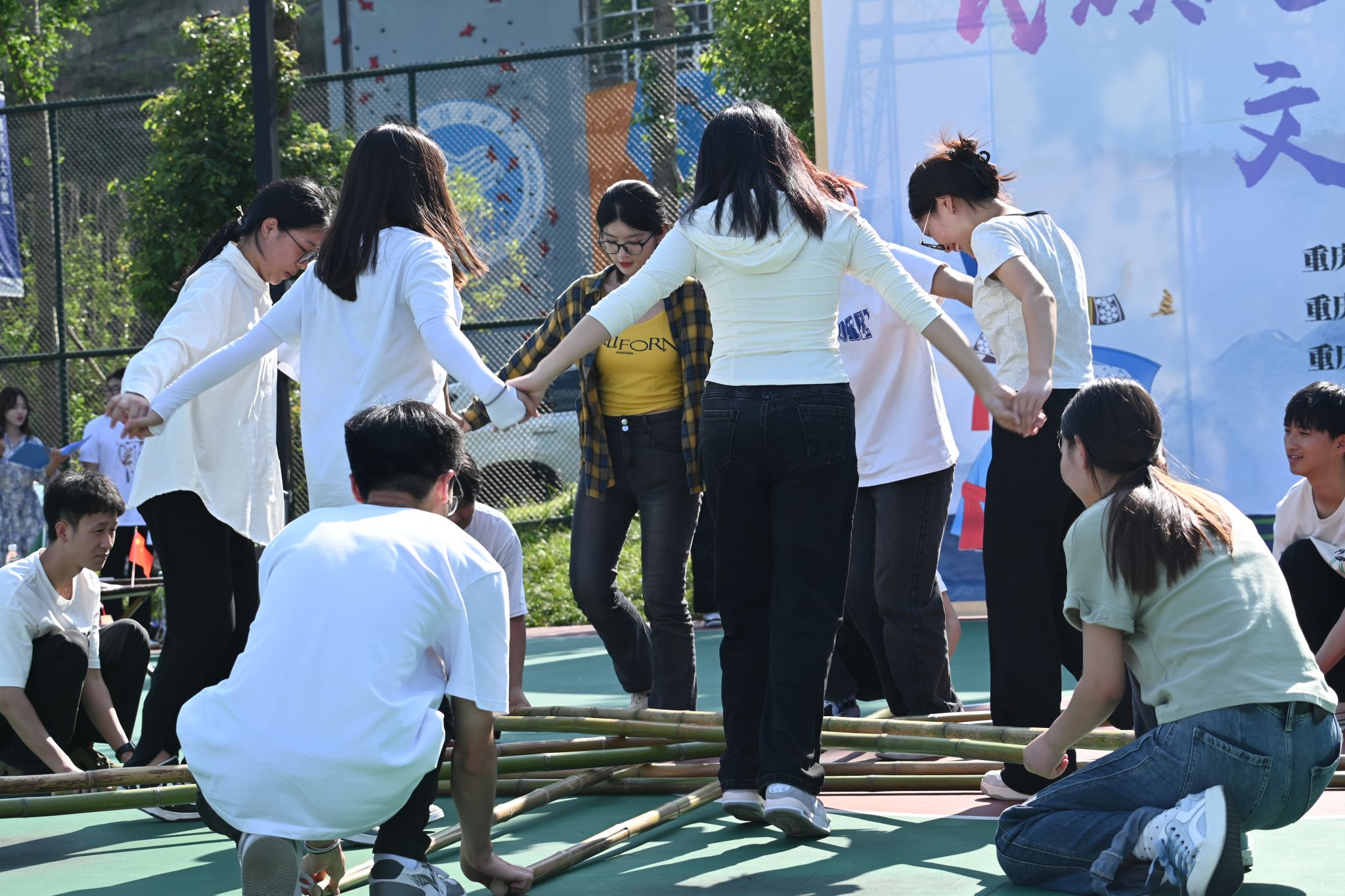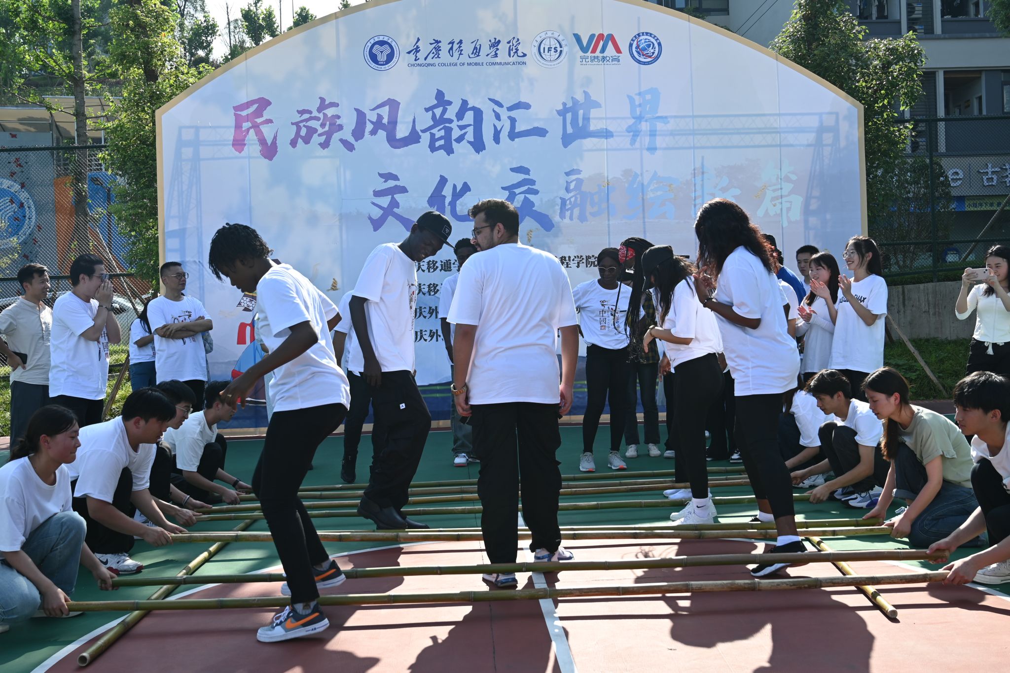 “蛮舞与黎歌,余音犹沓沓”,竹竿舞的节奏强而有力,舞者的身姿轻盈活泼,随着竹竿的开合,两脚不断跳跃,如同翩翩起舞的精灵穿梭于疾劲的竹竿之海,形成了一道绚丽且充满浓郁民族文化色彩的风景。在炫目的表演谢幕之际,热情洋溢的同学们邀请了外国友人们共同参与,他们兴致勃勃地穿越那交织的竹竿网,与舞者们共舞于这力量与韵律的交汇之中,共享这场文化的交融。
