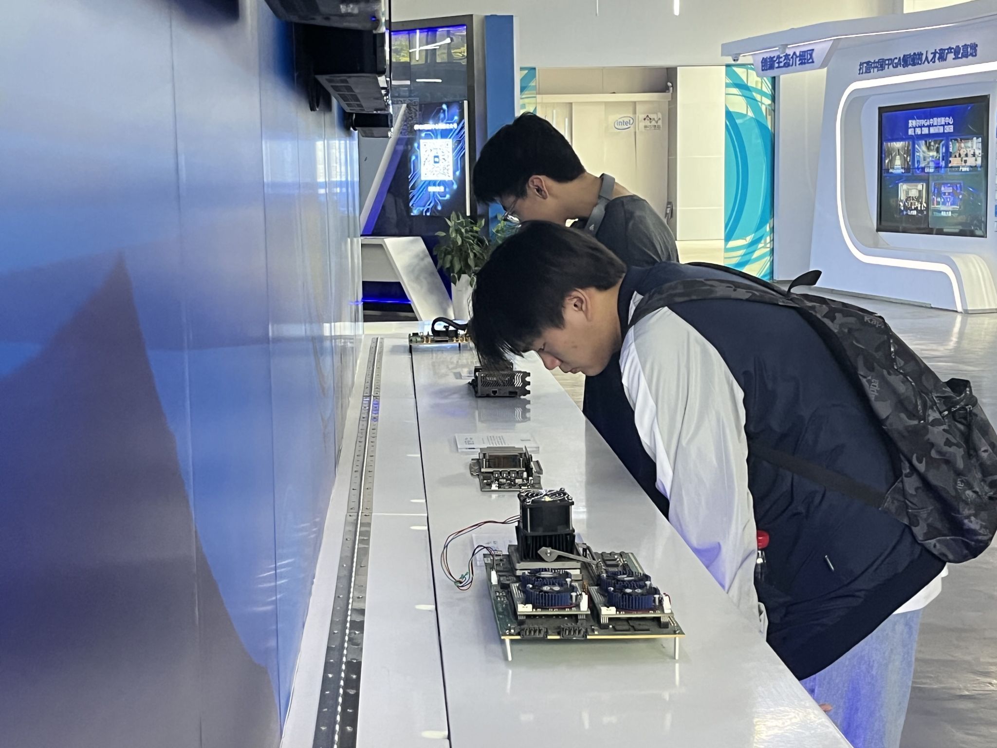 讲座过后,同学们参观了创新中心的展厅,实地感受了FPGA技术的魅力。在展厅内,中心工作人员向同学们介绍了FPGA云加速中心、蜂巢物联网实训套件、智慧农业-温室大屏监控等前沿项目,展示了FPGA技术在多个领域中的创新应用。这些生动具体的案例不仅让同学们对FPGA技术有了更加深入的了解,也激发了他们对创新发展的浓厚兴趣。