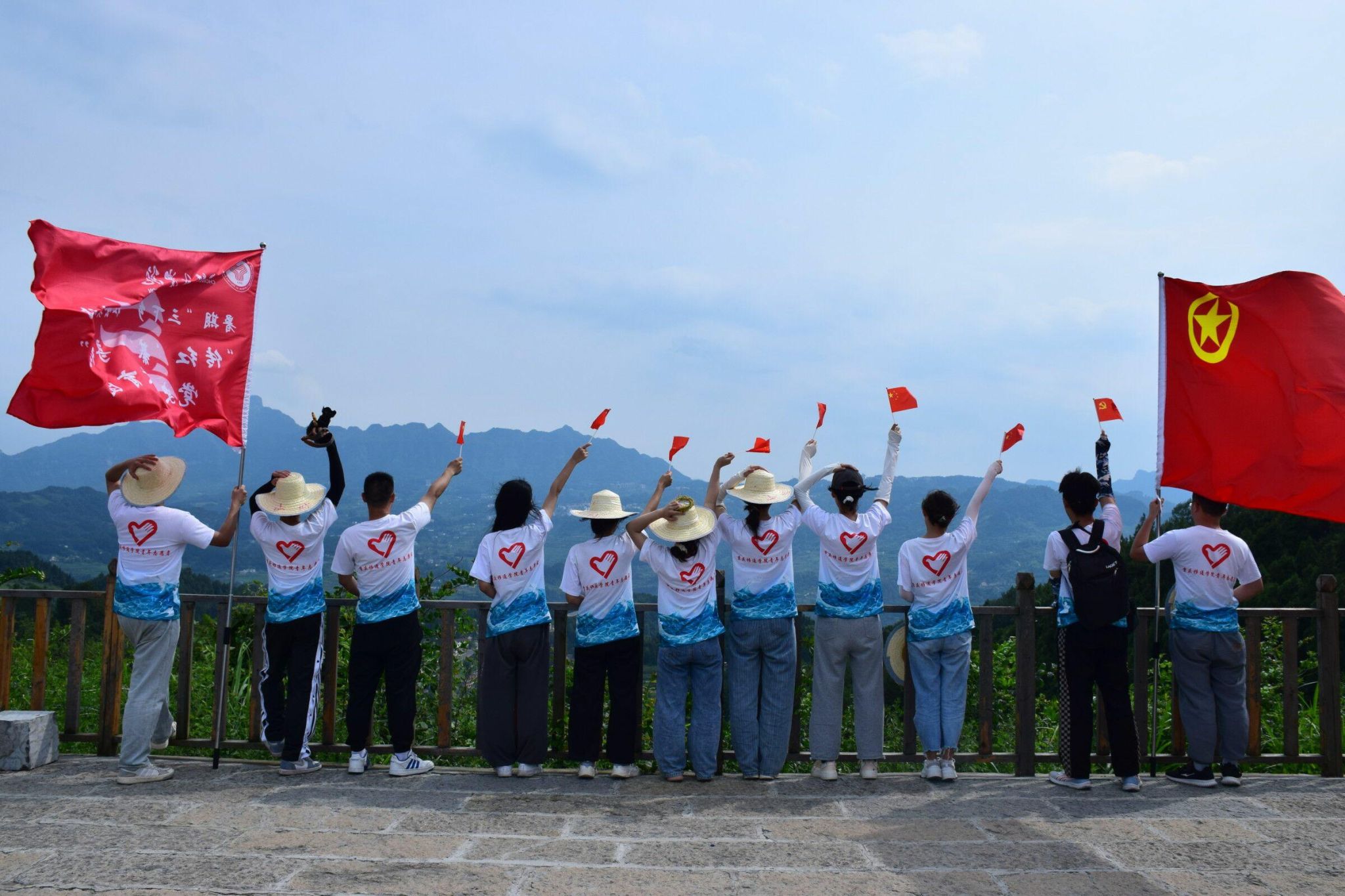 志愿者们到达了两省四村的交界点——大垭口,俯瞰整个红军街,大家都激动不已,在这里何书记也为我们介绍了“反穿草鞋”故事,机智的红军利用反穿草鞋为自己争取到了休整时间,这也证明红军长征的胜利离不开革命先辈的奋斗。
