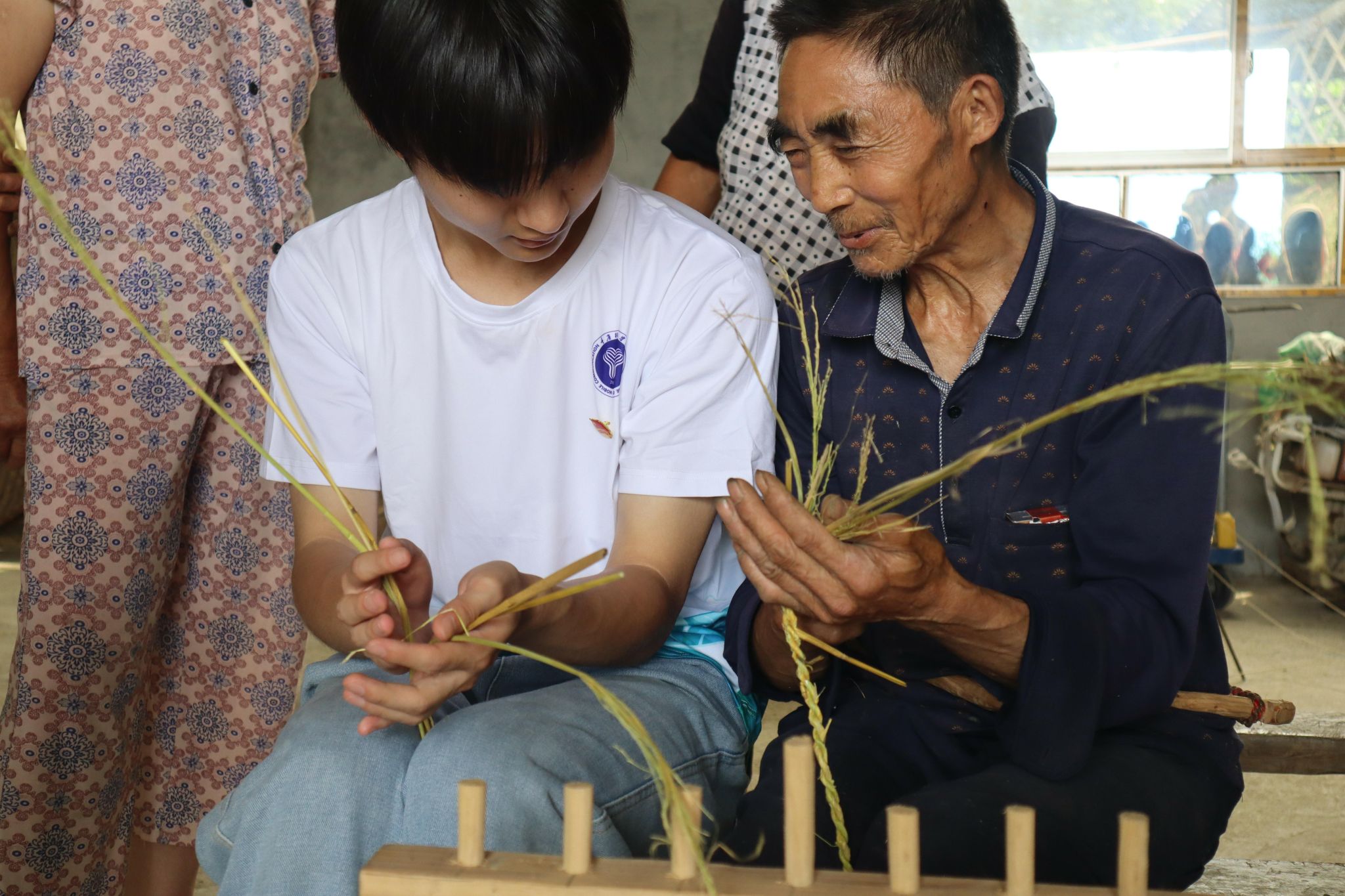 老爷爷向志愿者们展示了编织草鞋的过程,老爷爷手握四根干稻草,通过不停的交换稻草位置,不断交叉揉搓、增添稻草才能完成一根完整的草绳,扎实慢慢的揉搓才能拧成一股绳,成为最后的草鞋。这也证明成大事者需要脚踏实地,行稳致远的完成好每一件事。