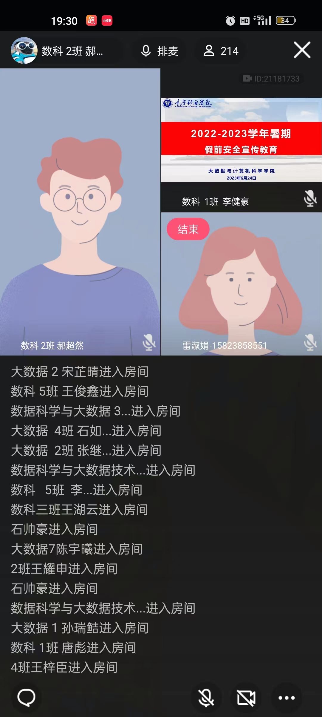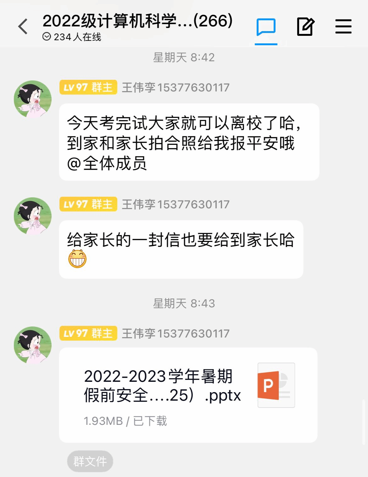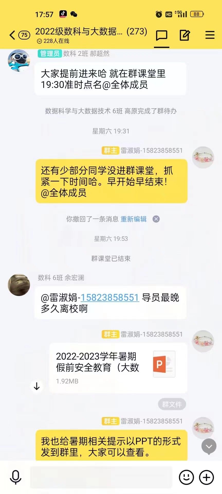 此次假前安全教育,辅导员老师们采用了线上主题会议、线下班委会(班会)、电话或信息联系家长,以及实地宿舍走访等方式召开,涵盖了暑期放假和开学安排、离校注意事项、暑期安全事项、未来职业生涯规划等四个方面。尤其在安全事项中,辅导员们通过宣讲人身安全、财产安全、交通出行安全、网络安全、饮食健康安全等全方位提醒学生提高安全的认识与能力。
