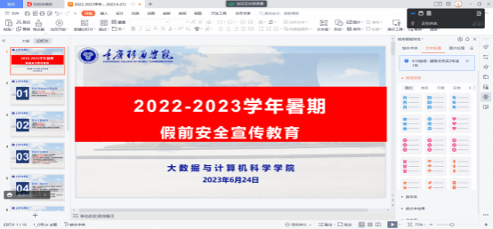 暑假悄然而至,为了增强学生的安全防范意识,筑牢学生暑期安全防线,减少暑期安全隐患风险,6月25日至6月30日期间,大数据与计算机科学学院全体辅导员通过多种形式、多种渠道开展了2022-2023学年暑期假前安全专题教育活动,全力确保学生度过一个平安、健康、有序的快乐假期。
