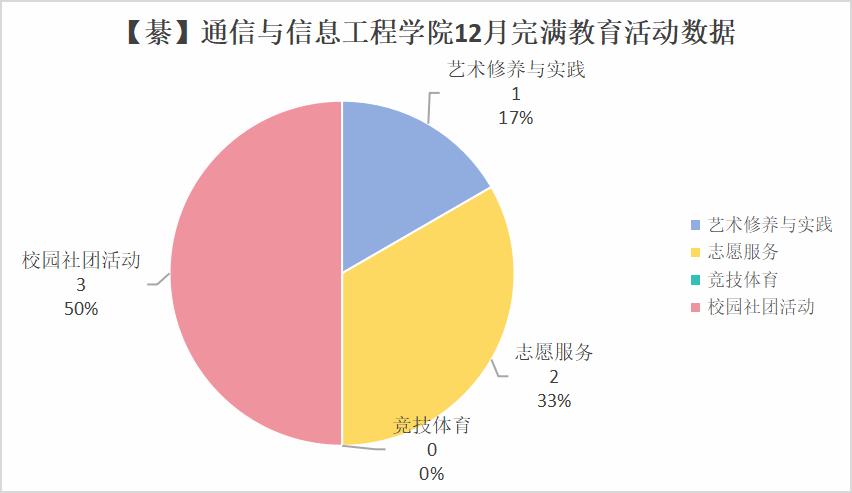 通信过程与信息工程学院完满教育APP管理小组对本院十二月的完满教育数据进行统计和分析,通信与信息工程学院(綦江校区)十二月份共推6场完满教育特色活动,其中校园社团活动3场,艺术修养与实践1场,志愿服务2场,竞技体育0场,覆盖人数121人次。