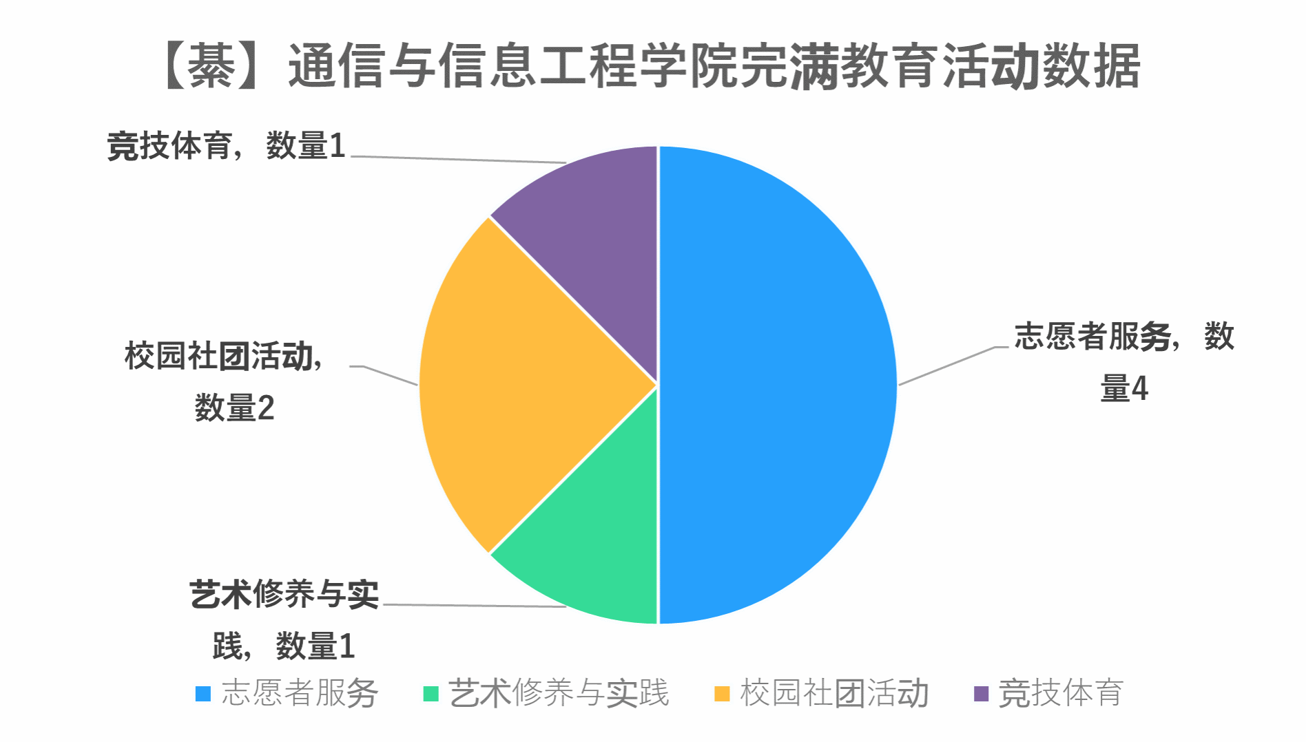 通信与信息工程学院完满教育APP管理小组对本院三月的完满教育数据进行统计和分析,通信与信息工程学院(綦江校区)三月份共推8场完满教育特色活动,其中校园社团活动2场,艺术修养与实践1场,志愿服务4场,竞技体育1场,覆盖人数为277人。