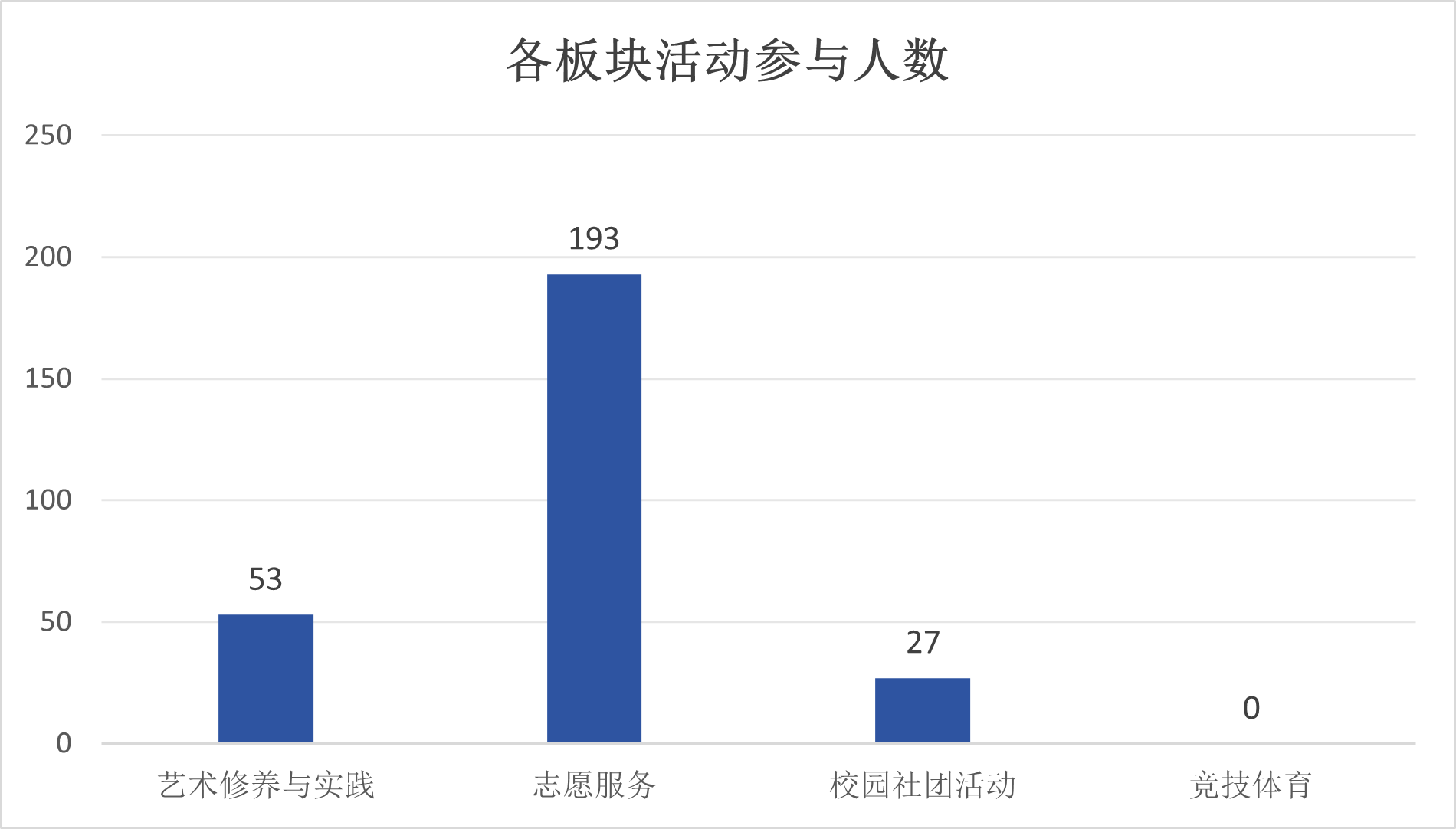 从三月的活动数据可观察出,本月的完满教育活动中,志愿服务板块参与人数最高,共193人,竞技体育活动板块参与人数最少,共0人。