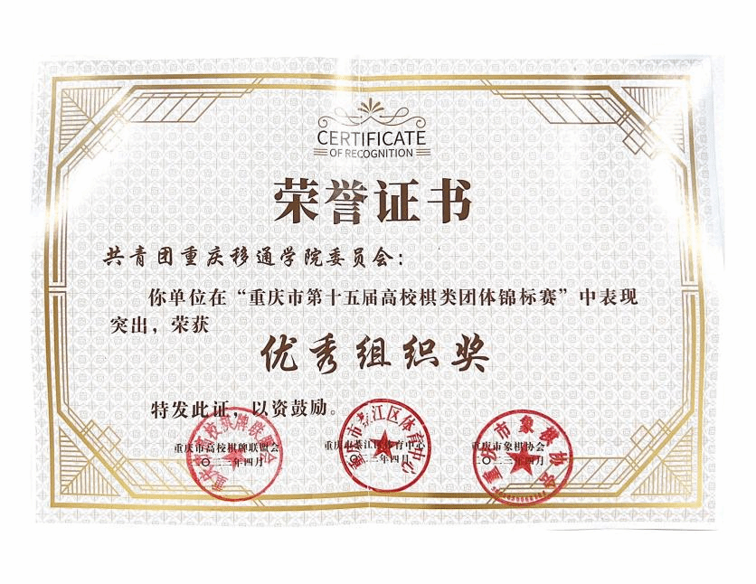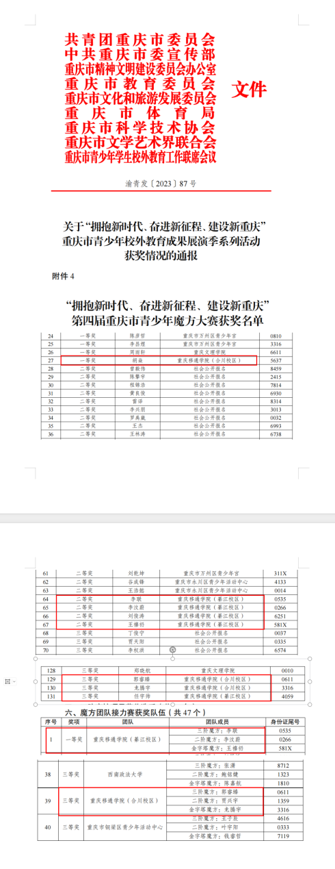 魔方协会带头斩获全市魔方团体竞赛第一名,单项个人赛8项好成绩,对外交流与赛事参与本年均有突破,达30余次。由校团委指导、弈秋棋社承办的重庆市第十五届高校棋类团体锦标赛成功拿下“优秀组织奖”。指导青花墨字“书画社”在首次与重庆市硬笔书法家协会的合作中破圈而出,获得重庆市硬笔书法家协会年度“先进集体”。