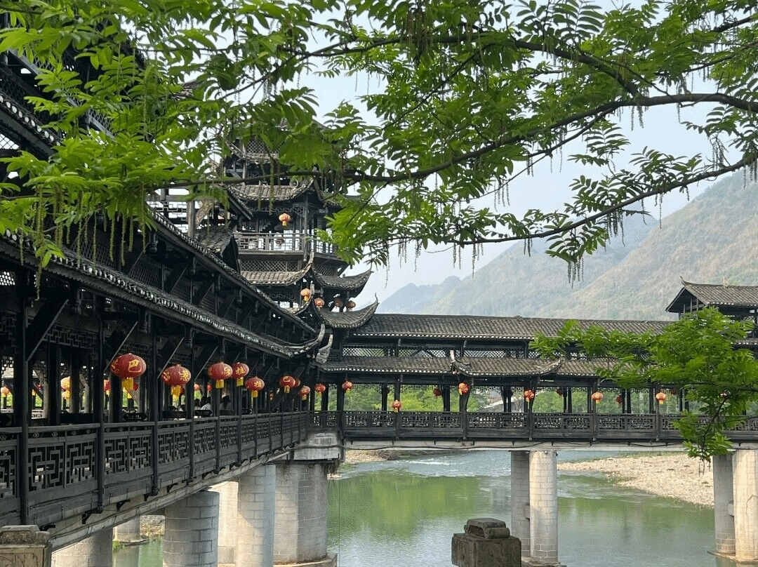纵眼望去,是廊桥古亭上的鲜红巴蜀灯笼。巴东三峡巫峡长,猿鸣三声泪沾裳。其间不仅能一览巴蜀雄浑群峰的壮丽,还能在闲暇之余置身古亭廊桥,观远方碧江,悟雾山青峰,展望顶上枝桠横生。