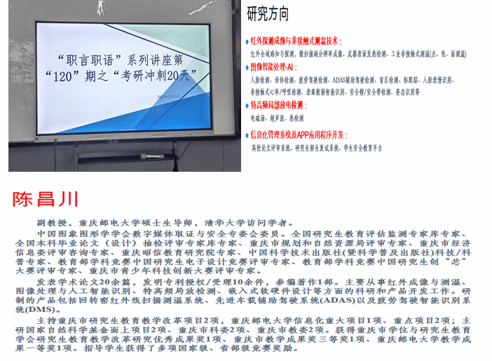 陈昌川,副教授,重庆邮电大学硕士生导师,清华大学访问学者。中国图象图形学学会数字媒体取证与安全专委会委员。发表学术论文20余篇,发明专利授权/受理10余件,参编著作1部。获得重庆市学位与研究生教育学会研究生教育教学改革研究优秀成果奖1项、重庆市教学成果奖三等奖1项。会议伊始,陈昌川老师针对在座考研学生的专业录取情况进行了讲解,以重庆邮电大学计算机和通信相关专业的历年研究生录取情况为例,通过相关数据显示,重庆邮电大学每年的研究生招生人数每年在不断增加,这也增加了大家成功“上岸”的机会。
