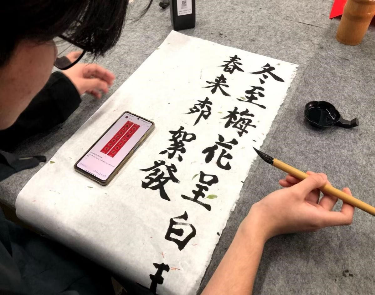 此次活动由学校书画社的资深社员进行现场指导,为同学们亲身示范春联的书写技巧和注意事项。在其指导下,同学们逐渐掌握了书写的要领,从基本的笔画到完整的春联作品,逐渐展现出了书法艺术的独特魅力。