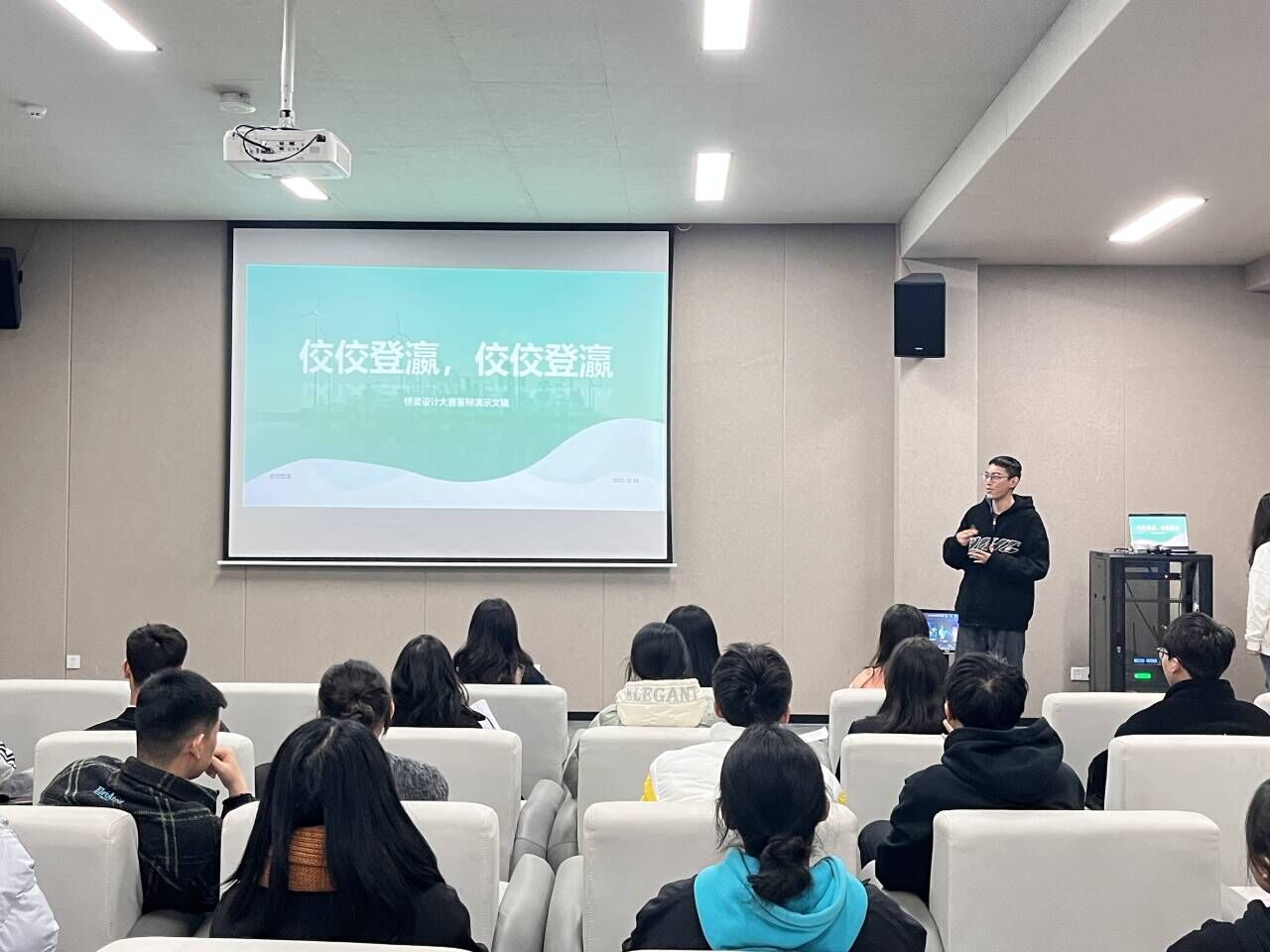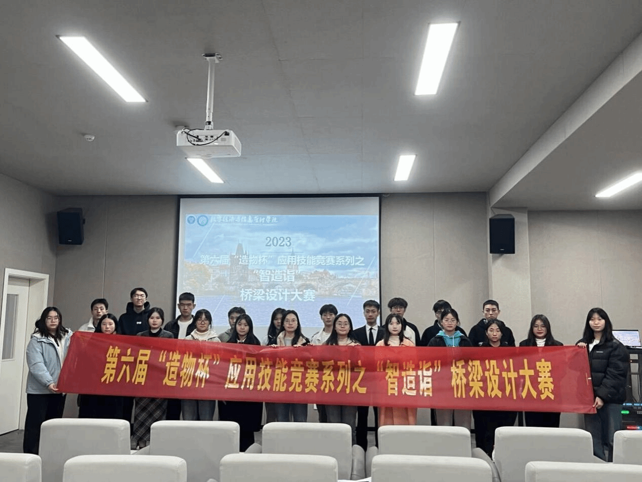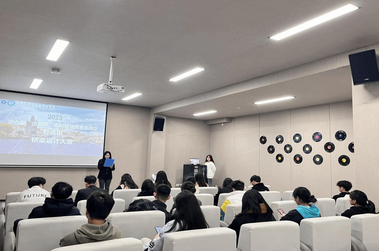 在中国悠久的传统文化中,桥梁一直承载着便民立民的重任,而在党的十八大中习近平主席也着重强调以桥为载体,铺展迈向复兴的新画卷。数字经济与信息管理学院于2023年12月8日13:30在瀛溪书院潜台词影视厅成功举办第六届“造物杯”应用技能竞赛系列之“智造诣”桥梁设计大赛初赛,本次活动有幸邀请到宣传板块指导老师田园园,社团活动指导老师周静,艺术修养与实践板块指导老师杨必菊莅临现场指导。