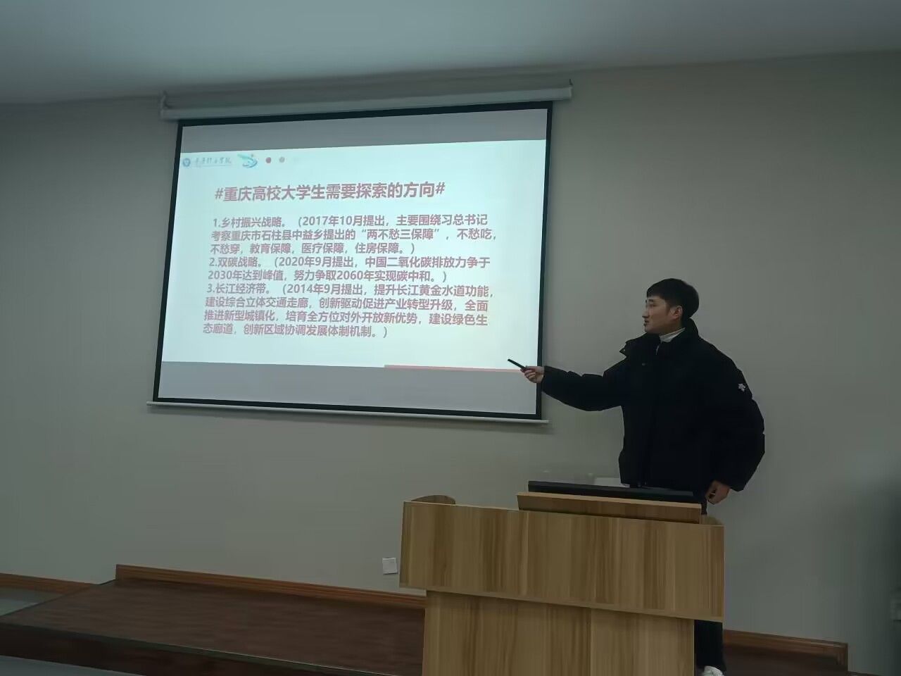 活动伊始,伍早金老师 介绍了“三创”挑战赛的含义和目的,其目的是为了激发大学生兴趣与潜能,培养大学生的创业能力以及团队协同的实战精神。其次,从“重庆高校大学生需要探索的方向”入手来进行阐述“三创”挑战赛总体概况介绍,其中包含了乡村振兴战略、双碳战略和长江经济带等方面。