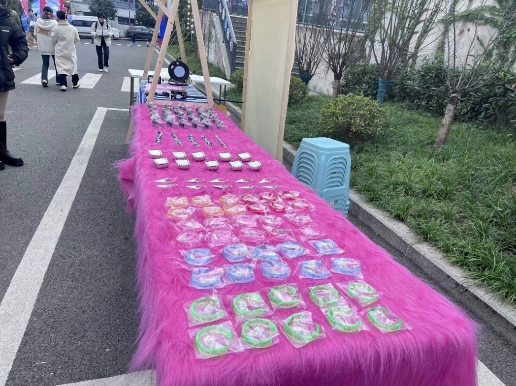 未来集市是嘉年华的首个要点,美妆协会在集市上所打造的妆容成为嘉年华的“入场券”。多种装饰,超有科技感的银色眼镜、发光透明眼镜,超炫酷的脸部银饰,氛围感精灵耳以及瀛洲科幻学院和Colorful美妆协会联名的超亮发光手环供同学们选择。此次美妆协会成员分为两拨,一方面为同学们打造极致特效妆容,另一方面为其编造带有科技化的发型,再通过科幻化首饰加以装饰,让同学们全方位体验AI科幻妆造,沉浸式融入科幻世界。