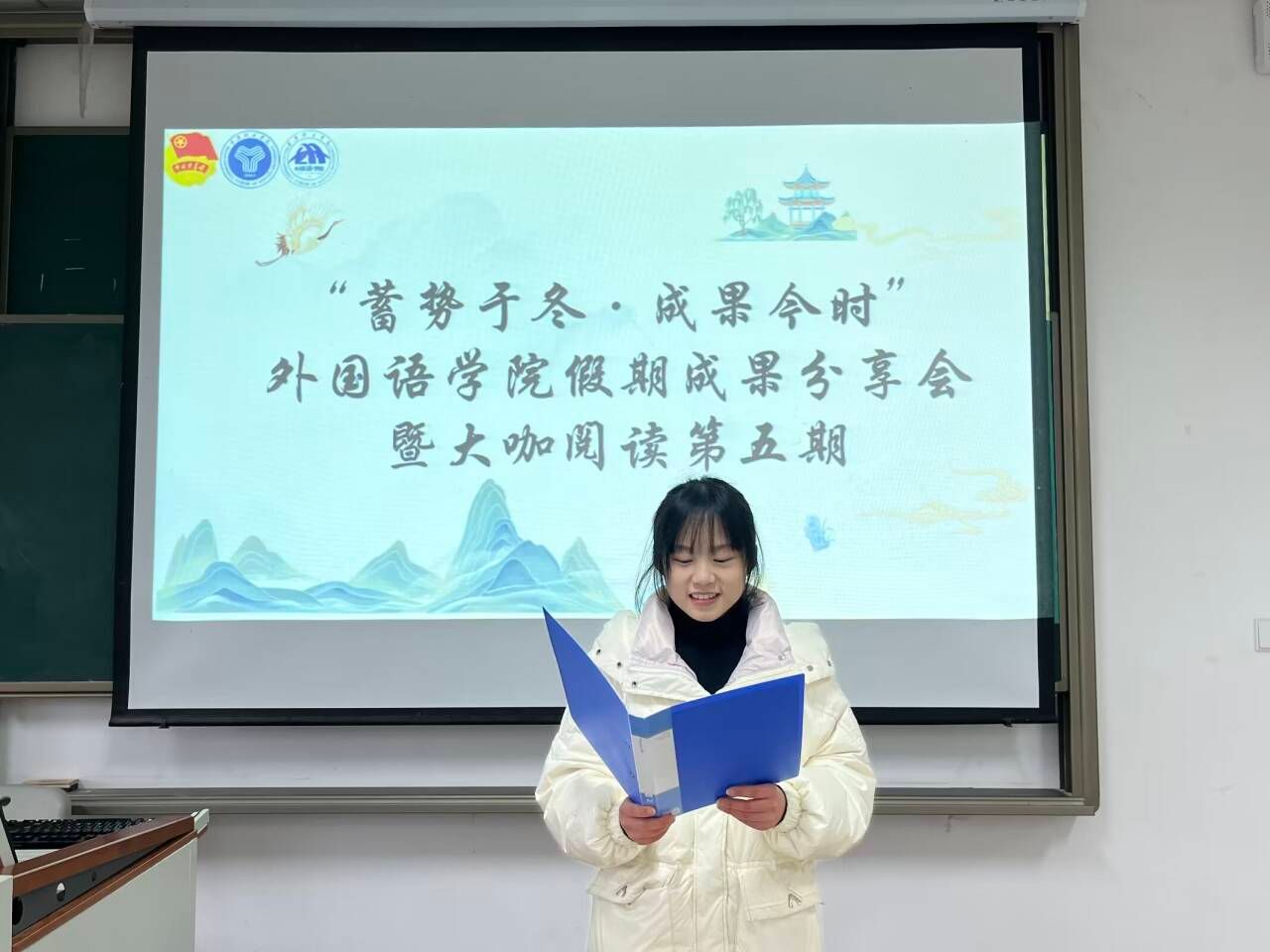 经过漫长寒假的历练,新学期我们蓄势待发。为充分了解同学们假期学习能力及实践能力,进一步提升同学们的语言表达能力,外国语学院第四届第一任组织部与调研部于2024年3月6日开展“蓄势于冬·成果今时”国语学院第四届第一任学生组织假期成果分享会暨大咖阅读交流会第五期。