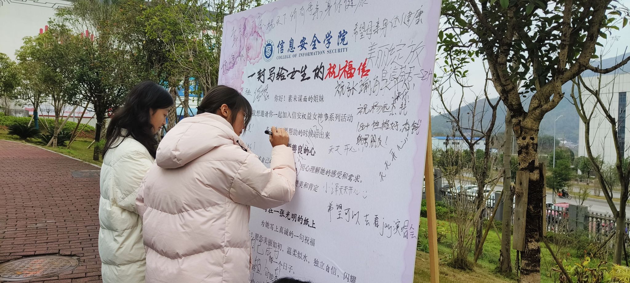 信息安全学院于3月6日下午在綦河书院一号楼主干道举办了“巾帼不让须眉,展示女生风采”女生节祝福语收集活动。大家写下祝福标签,送上自己的祝福,晚上还在银河影音室一同观看电影《夺冠》。本次活动旨在鼓励女性朋友们勇敢表达自我,用祝福传递温暖。