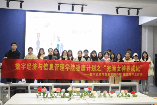 朱唇一点桃花殷,宿妆娇羞偏髻鬟。为全面活跃同学们的校园文化生活,丰富同学们的精神世界,更好地展现当代女大学生青春亮丽、积极向上的风采。数字经济与信息管理学院于2024年3月8日在綦河书院观涛·多媒体功能室顺利开展“雏鹰计划”之完满女神养成记暨女生节子活动之美妆沙龙交流会。本次活动由我院权益女生部主办,服装美学工作坊承办。活动有幸邀请到了数字经济与信息管理学院学工办主任任超群老师、社团活动板块指导老师周静老师、志愿服务板块指导老师张静老师作为指导嘉宾出席。