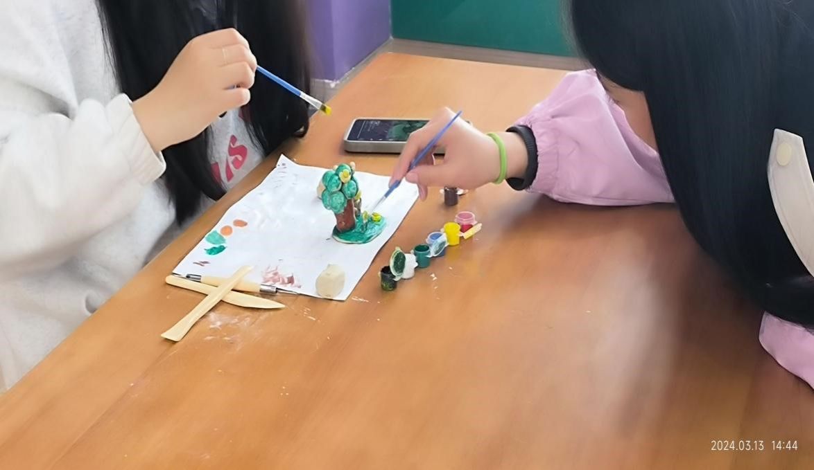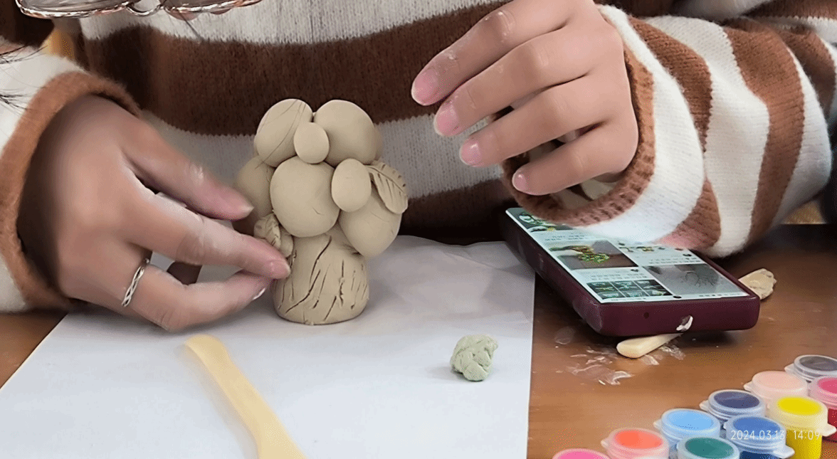 活动现场,同学们踊跃参与。五彩斑斓的粘土材料整齐地摆放在桌面上,同学们挑选完自己喜欢的颜色后,就开始了粘土创作,通过搓、团、捏、接、压等方式,将粘土塑造成各种形状和造型,再组合成各式各样的大树。在粘土创作的过程中,同学们充分发挥了自己的想象力和创造力,不断尝试、探索、实践。他们互相交流、分享创作思路,互相帮助、互相学习,共同完成了许多充满创意的作品。每一件作品都凝聚了同学们的汗水和智慧,展现了他们的个性和才华。