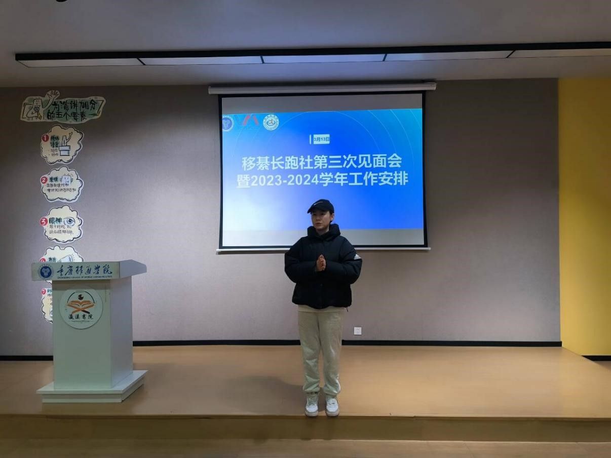 会议伊始,移綦长跑社社长郎东洲对上学期社团活动进行了总结与汇报。同时,也肯定了每位同学的努力与坚持。社长提到了社团集训时间及日常出勤等方面现存的不足之处,希望大家能够在社团中找到目标与榜样,养成自律、坚持的好习惯。