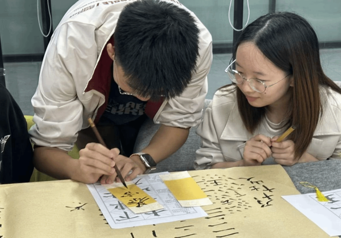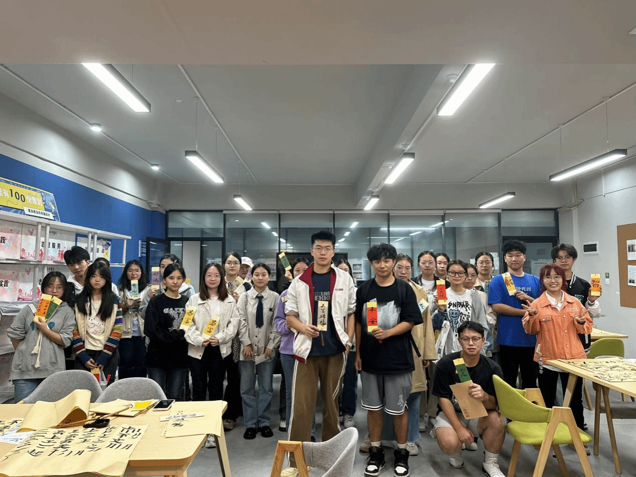 活动迎来尾声,老师提醒参与的同学们书法课堂即将下课,并邀请参与的同学们携自己的书法作品进行合影留念。
