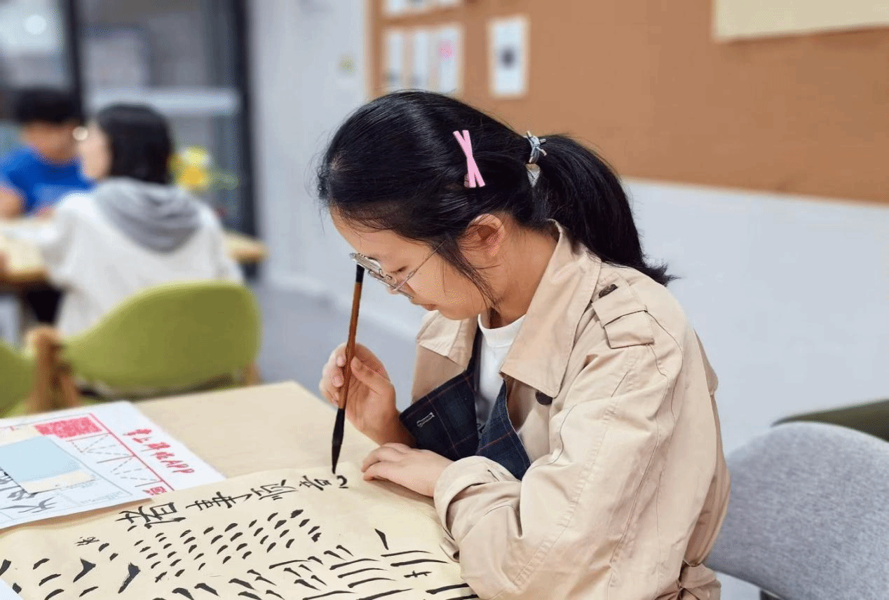 欣赏完优秀的书法作品之后,老师让同学们自己进行练习。随着活动时间的推移,整个课堂萦绕着悠韵墨香。逐墨纸上尽显才华,笔落汉字尽书心意,在老师的细心指导之下,可以看出同学们都已深入书法的墨涌之中。