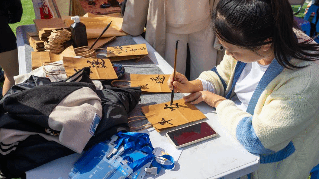 青花墨字书画社通过书法与绘画相结合,以歌词的韵律,用纸袋为承接,开展一系列独特新颖的书法展示与互动活动,消除传统书法的看法,以笔墨为媒,传递乐观向上,积极进取的心态和音乐之美。