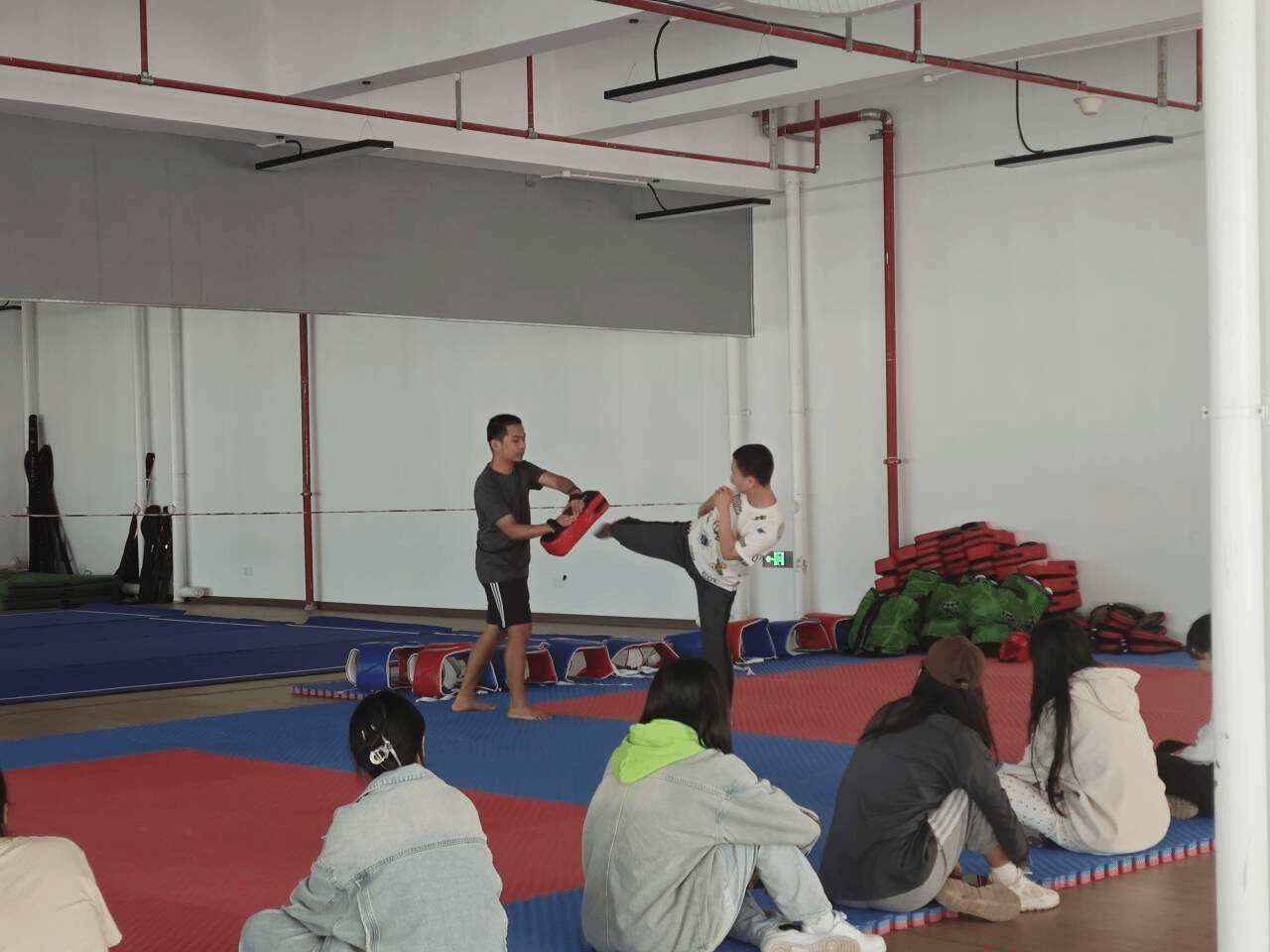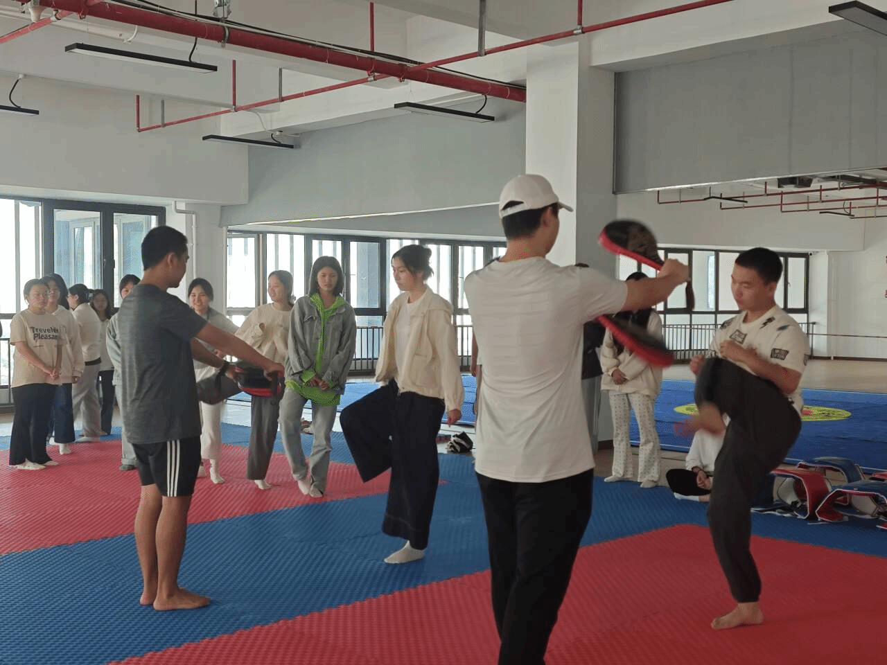跆拳道是一项以手脚技术为主要攻击手段的运动,强调速度与力量的结合,注重技巧与策略的运用。本次活动中教授了跆拳道的基本腿法比如前踢,横踢,单飞,双飞和旋风踢。