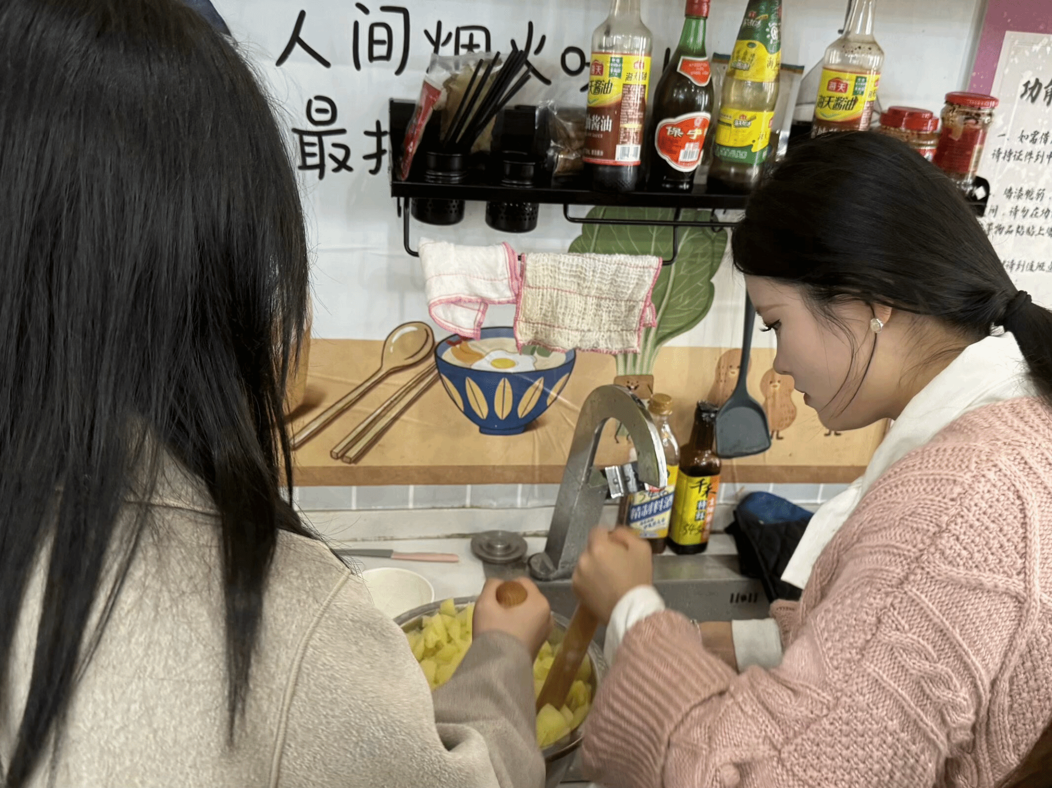 制作环节中,四名参与者积极动手,认真清洗土豆、调配浇汁,谨慎把控火候和时间。伴随着时间不断的流逝,在参与者的努力下,浇汁土豆泥的一道道工序完成,土豆泥奶油般细腻光滑的表面,微微泛着淡淡的黄色光泽,像是被阳光轻拂过。