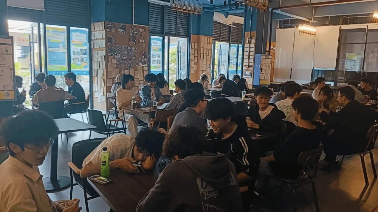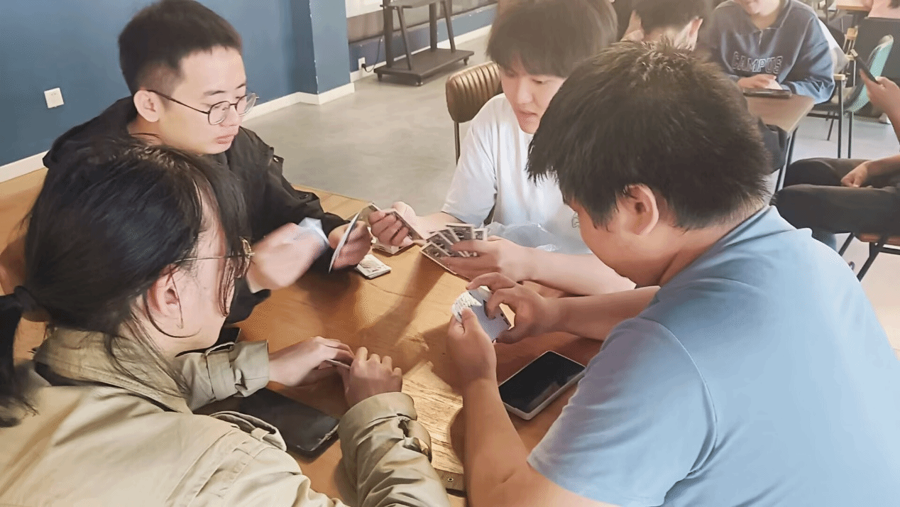 活动当天,来自重庆移通学院的96名参赛者齐聚一堂,共同展开了一场集智慧、策略与欺诈一体的强大脑力较量。活动现场热闹非凡,玩家们时而因识破谎言而欢呼,时而因自己被惩罚而尖叫,紧张刺激的氛围弥漫在空气中。每一次出牌都是一场心理大战,玩家们目光交汇,火光四溅,出真牌者面不改色,出假牌者努力伪装,毒酒道具的存在更是将这种紧张推到极致,欢笑声与惊叹声交织,构成了独特而热烈的现场氛围。