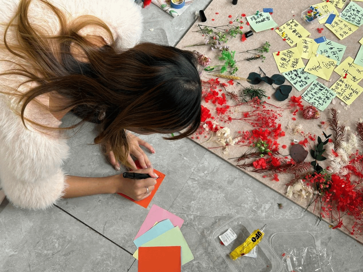 随着阳光洒下,活动也拉开了序幕,以干花为笔,软木板为纸,冬日春景即将跃然“纸”上,营造出一派缤纷景象。活动伊始工作人员播放着轻柔的音乐,引领着每一位参与者步入装饰艺术的殿堂,指导参与者如何搭配五彩斑斓的素材,亲手绘制心中的梦幻花墙。参与者们在工作人员的引领下,满怀憧憬地开启了创作之旅。