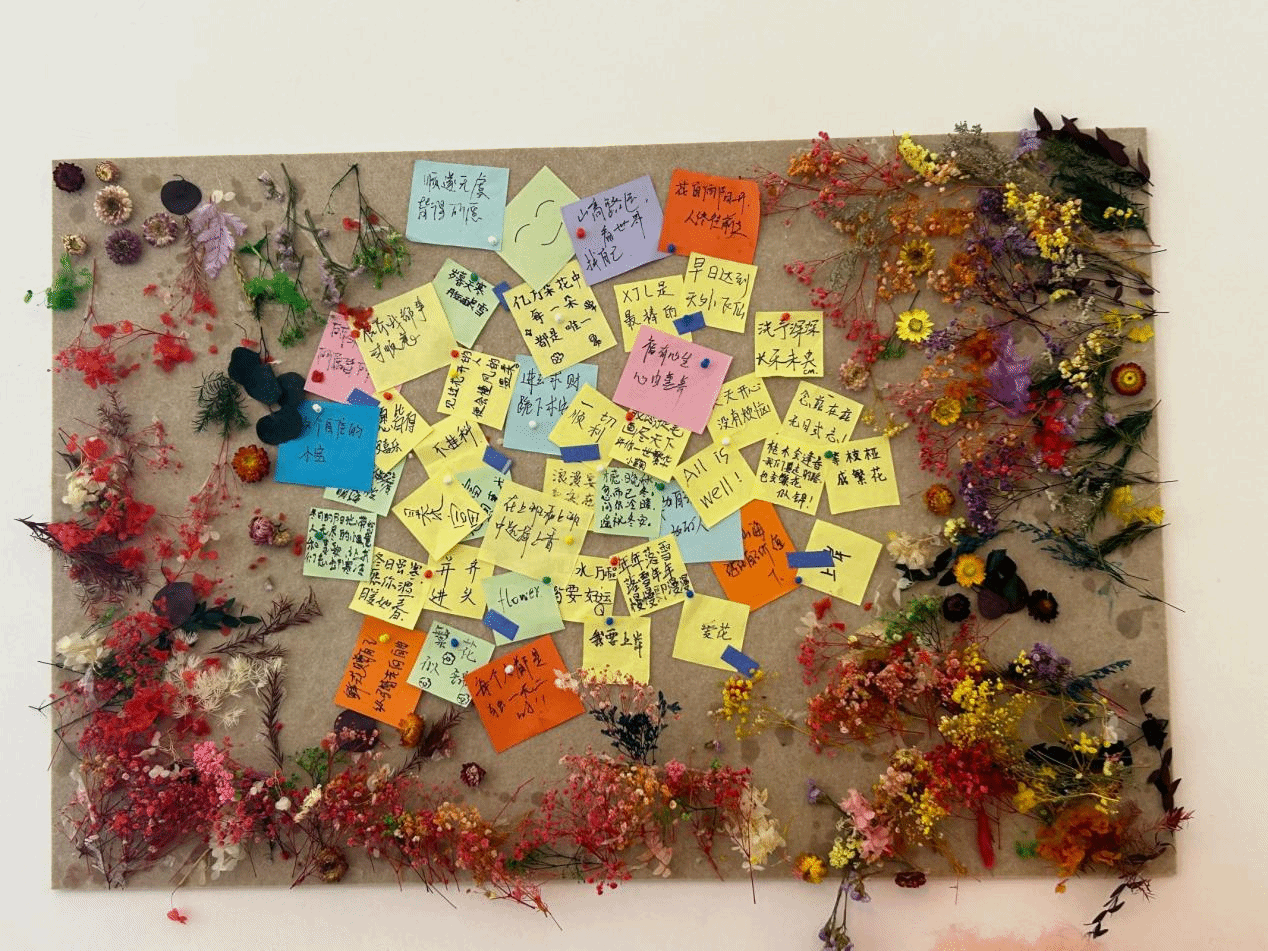 时光荏苒,活动的尾声悄然降临。在每位参与者不懈的努力与创意的浇灌下,原本素朴无华的软木板,已然蜕变成一幅色彩斑斓、生机盎然的花墙。最后,参与者们用一张张写满冬日寄语与祝福的便利贴将花墙点缀,这一句句寄语不仅有对自己的期望,也有对陌生人的祝福,同时也为花墙增添了几分温馨与浪漫。这些寄语,是人与人之间真挚情感的流露,让大家一起将这份美好的记忆,深深的烙印在每位参与者的心中,成为一段永恒的记忆篇章。最后这面汇聚了无数创意与祝福的花墙,移送至玉棠书院进行了展示,为路过的同学们增添了一份视觉与心灵的双重盛宴。花墙前,同学们驻足欣赏,有的拿出手机拍照留念,有的则在便利贴上写下自己的祝福,加入到这面充满爱与希望的墙中。