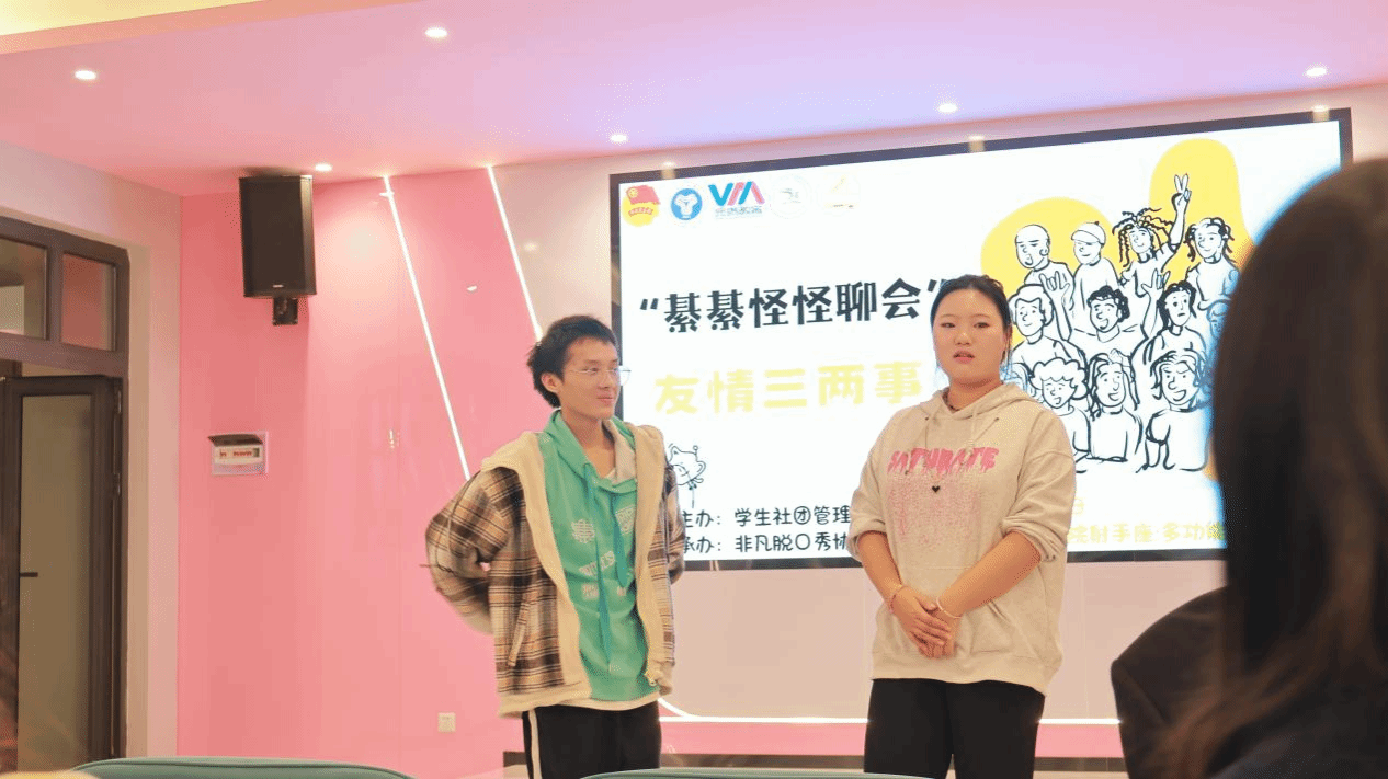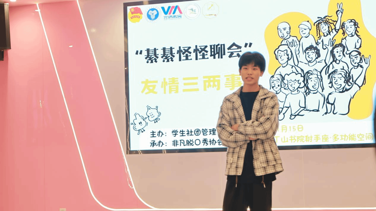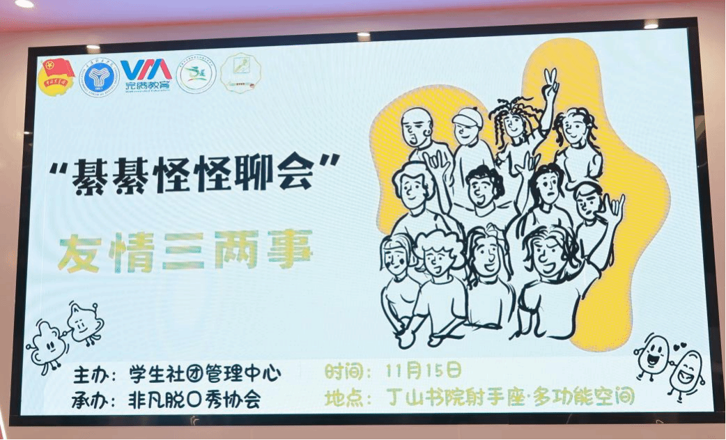 为了给同学们搭建一个互相交流的平台去分享他们友情故事,增进对友情内涵的理解,让大家重新审视身边的朋友,回忆那些温暖的瞬间,在快节奏的学习生活中重拾情感的温度。非凡脱口秀协会于2024年11月15日在丁山书院射手座·多功能空间开展了“綦綦怪怪”聊天会——“友情两三事”的活动。