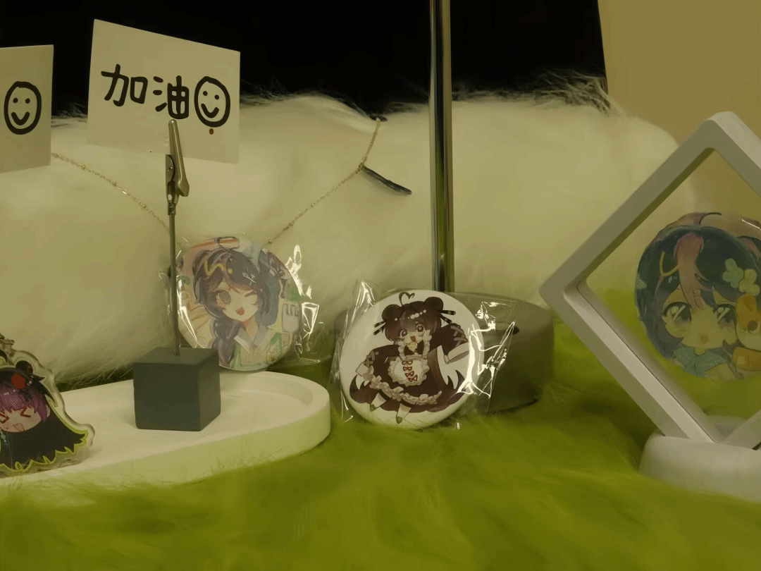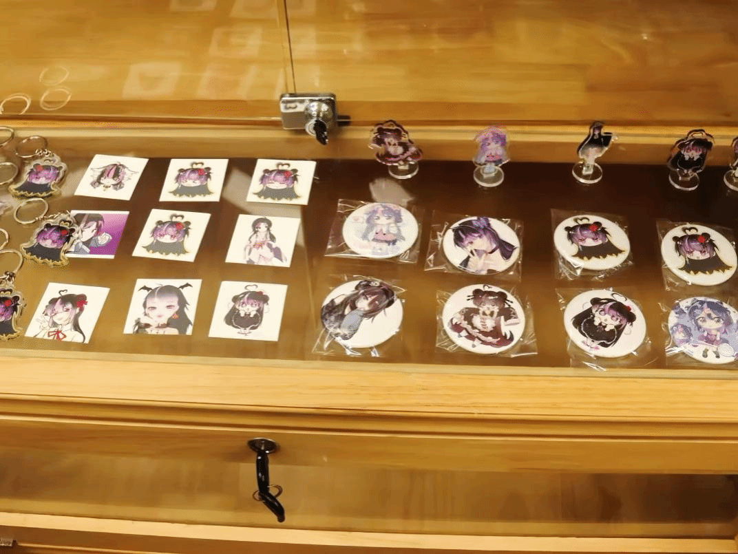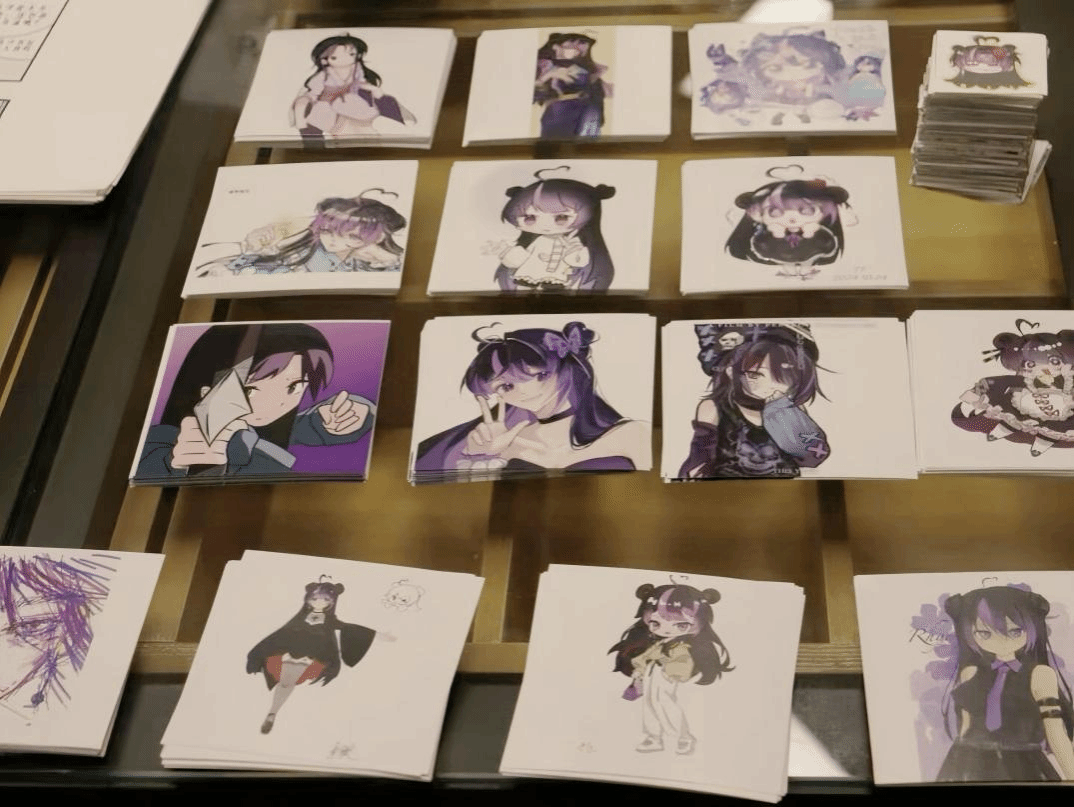 在活动的最终线下现场,可以看到琳琅满目的二创作品。明信片、亚克力牌、徽章设计、亚克力夹子……