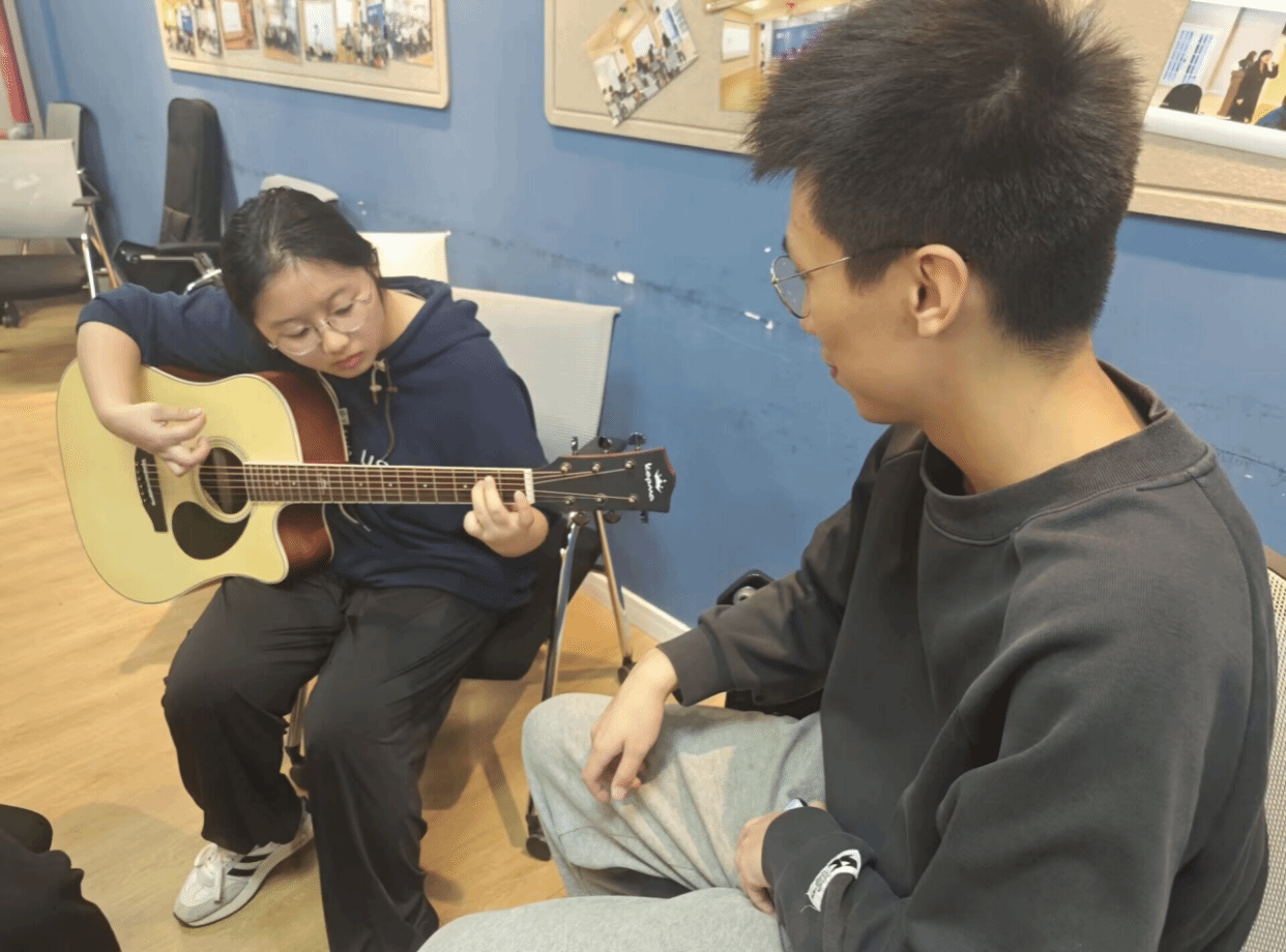 除了基本技巧的教学,教学部还向同学们介绍了进阶技巧,如交替拨弦、经济拨弦等,并鼓励他们勇于尝试,不断提升自己的演奏水平。在教学的过程中,同学们不仅学到了吉他演奏的技巧,还深刻感受到了音乐的魅力和力量。