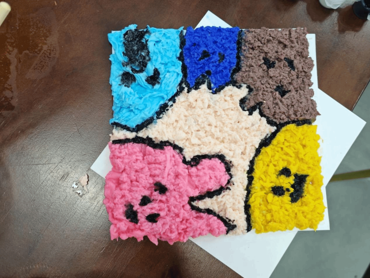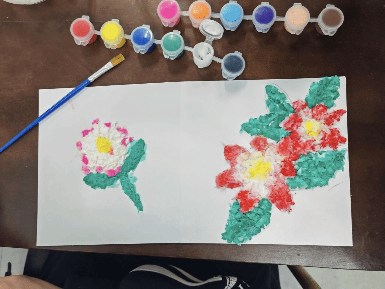 参与者完成后,一幅幅承载着创意与情感的纸浆画跃然眼前,工作人员组织大家把作品放在一起并且介绍自己作品灵感的来源以及所表达的情感。纸浆画的肌理感使其像浮雕一样具有立体感。在看到这些纸浆画放在一起时,仿佛在欣赏一场浮雕的艺术展览,美轮美奂,正如诗中所云:“艺术之花遍地开,美在心中永不衰。”