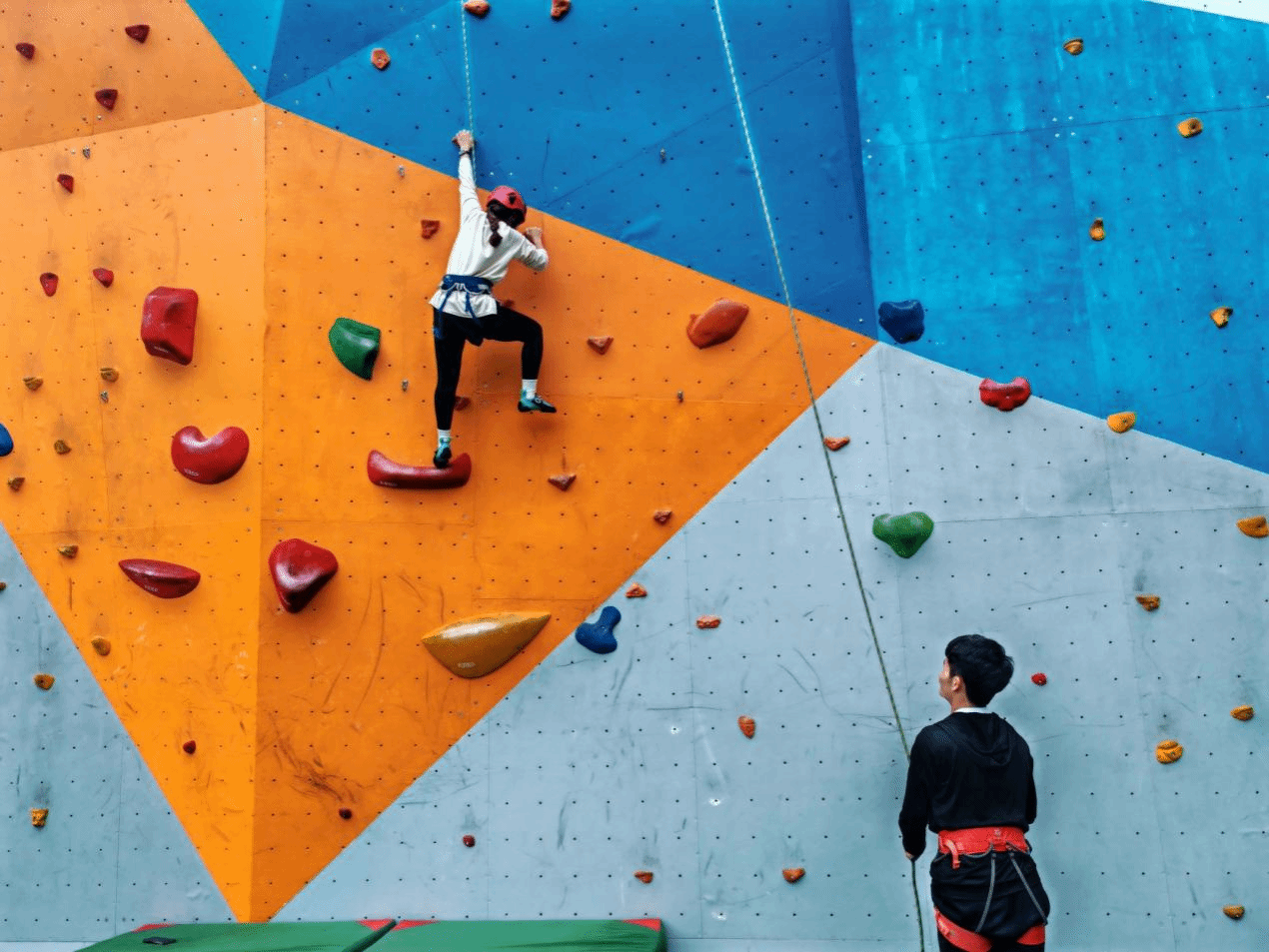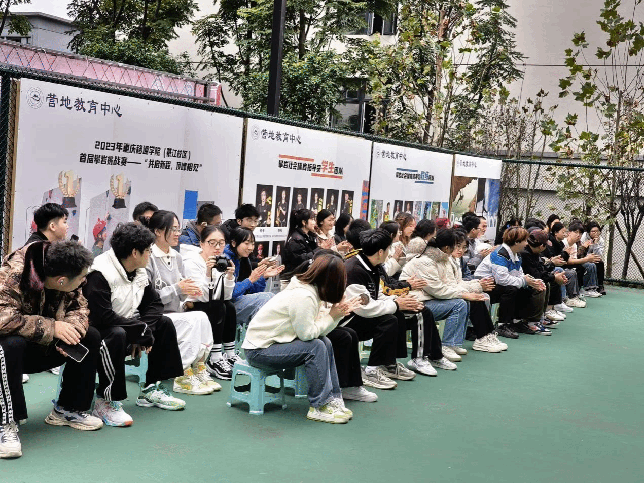 那攀岩场地上的岩壁高耸入云,宛如一座天然屏障,静候勇敢者来征服。攀登者们每一步都迈得谨慎而有力,一旁旁观的同学也目不转睛、屏住呼吸,仿佛要将自身力量传递给攀岩者。岩壁上那些形态各异的攀爬点,恰似天然阶梯,引领他们向顶峰迈进。随着高度攀升,难度也在逐渐加大。但他们脸上的坚定与执着,无不诉说着对挑战的无畏和对胜利的渴望。