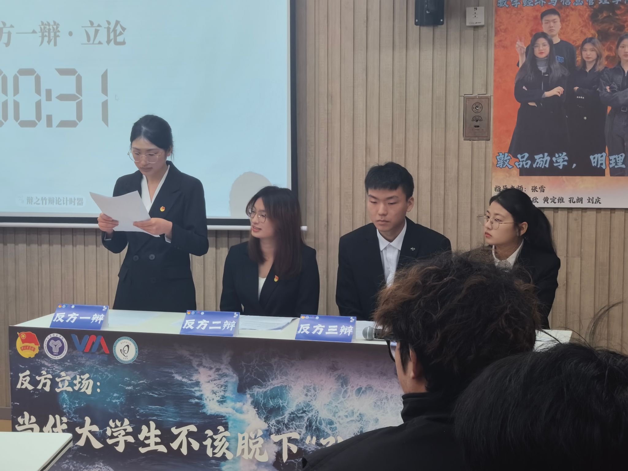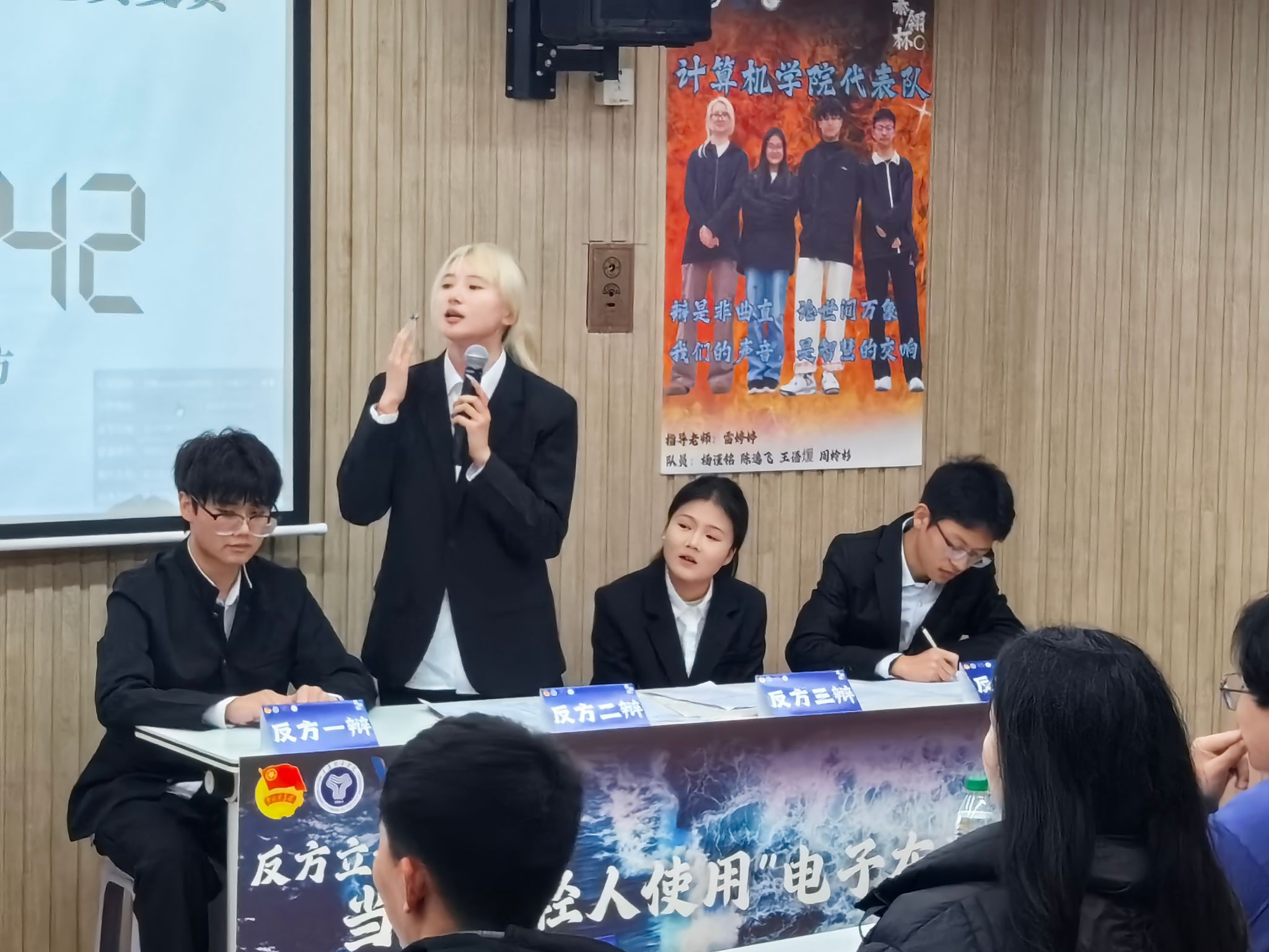 而后着眼于大健康管理学院与计算机学院辩论场,正方辩手侃侃而谈:“当代年轻人面对各种压力只有认识到使用电子布洛芬是自我麻痹,我们才能迎来救赎的机会。”而反方辩手从电子布洛芬的定义出发,“电子布洛芬以独特的方式为年轻人提供了情绪调节自我认知成长,是一种不可或缺的自我救赎方式。”双方辩手从不同角度深度剖析利弊,条理清晰、论据充分,为大家呈现出一场言语的盛宴。