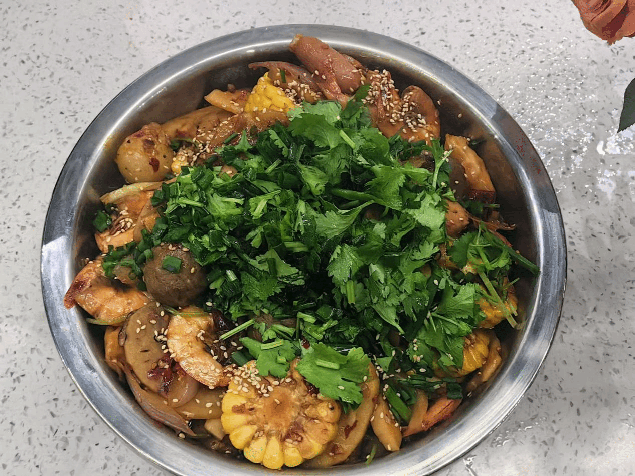 当腌虾的步骤圆满完成,烹饪组的接力棒就开启了。烹饪组的同学们先将铁锅预热,倒入适量的油,待油花四溅时,加入葱姜蒜等调料爆香,再将腌制好的虾倾入锅中,伴随着“滋滋”作响的美妙旋律,虾身在热油中渐渐换上了诱人的金红色外衣。烹饪组的同学们配合默契,一人掌勺翻炒,一人调控火候,另一人则适时加入秘制调料。在同学们的共同努力下,一盘盘色泽诱人、香气扑鼻的干锅虾终于新鲜出炉。