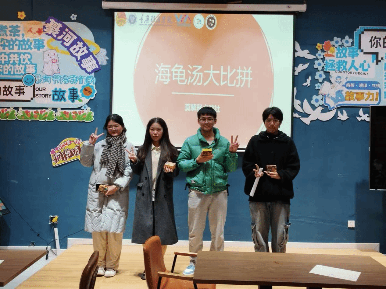 为了锻炼同学们的推理能力、激发同学们的创造力、培养同学们的逻辑思维、批判性思维、锻炼同学们的社交能力,同时推动桌游文化在我校学生群体中的普及和发展。莫解释桌游社于2024年12月18日,在綦河书院二号楼东篱·故事茶馆举办了海龟汤桌游体验活动。