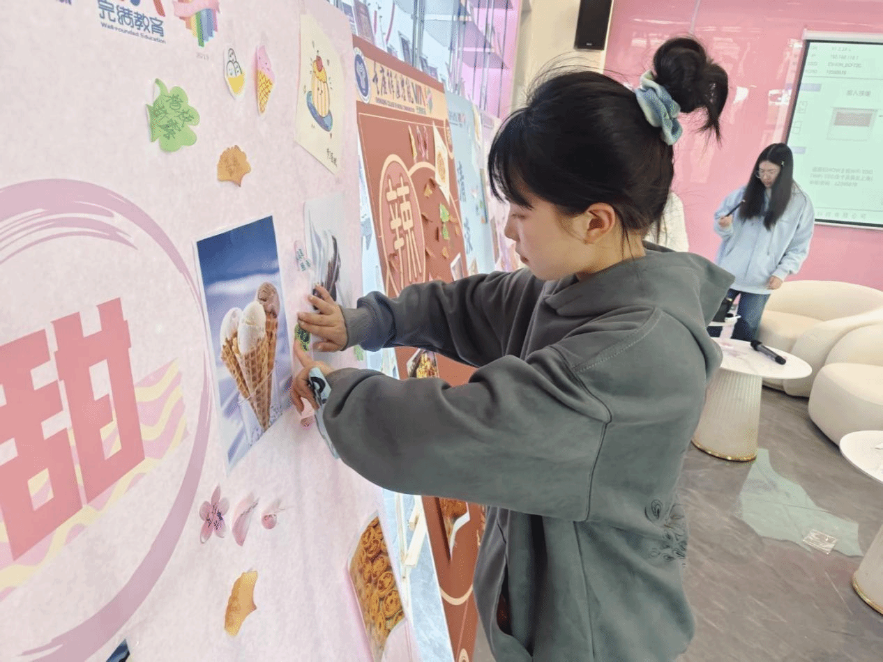 美食碎片区引导同学们体验“酸甜淡辣”。同学们在便利贴上写下自己最喜欢的食物,并分享与之相关的幸福时刻。一位同学兴奋地说她最喜欢吃的是火锅,每次和家人一起吃火锅,热热闹闹的,让她觉得特别幸福。说着,她将写有“火锅”的便利贴贴在了红色区域。在这个活动中,食物成为了情感交流的纽带,通过以味觉为线索,分享食物的故事与点滴,参与者不仅是在讲述自己爱吃的美食,更是在向他人传递一种关于幸福的理解与如何获得幸福感。