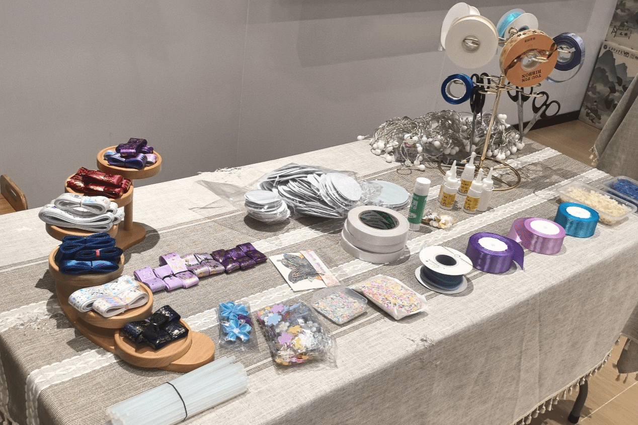工作人员们提前布置好现场,等待着参与者的到来。周边挂着经典动漫人物海报,摆着各色的气球,以及用于今天活动手工艺品的制作材料,丝带、布料、金属配件、亚克力板等。同时为了展示此次活动参与者们所完成的手工艺品成果,工作人员们布置了各种不同的区域,如吧唧托区,徽章区,钥匙扣区等。
