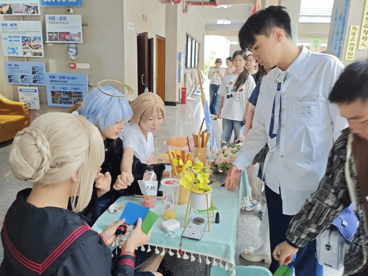 “春日宜打卡”区域位于綦河书院中庭,巨型装饰画幅尤为夺目,绘制物品装饰在上面,显得色彩明艳动人,瞬间抓住众人目光,成为天然的拍照打卡点 。大型装饰相框风格独特,巧妙地框起活动中的精彩瞬间。同学们或持周边拍照,或cosplay打卡,创意十足;DIY区提供丰富材料,大家制作春日相框与扇子,留下独特春日纪念。