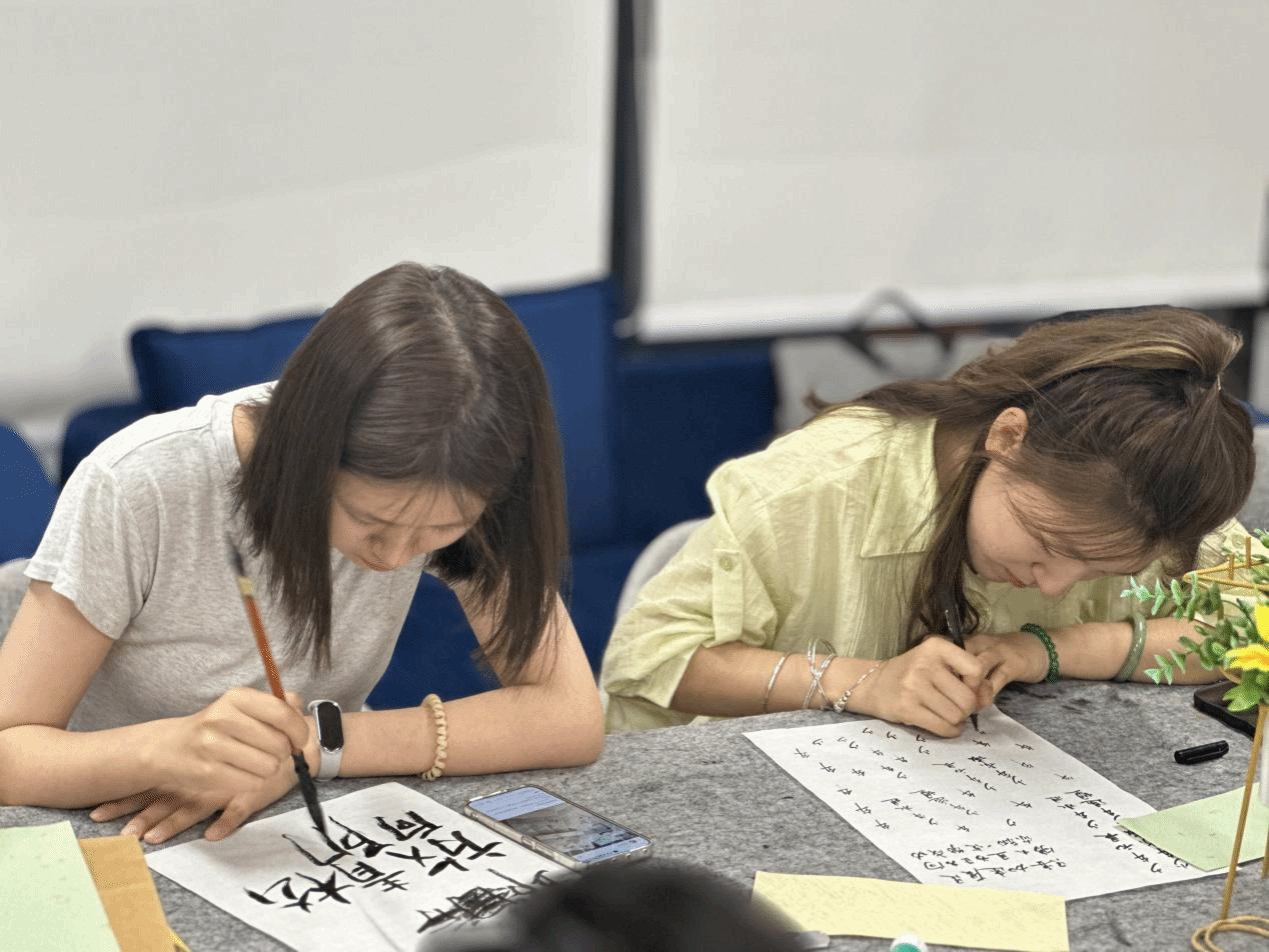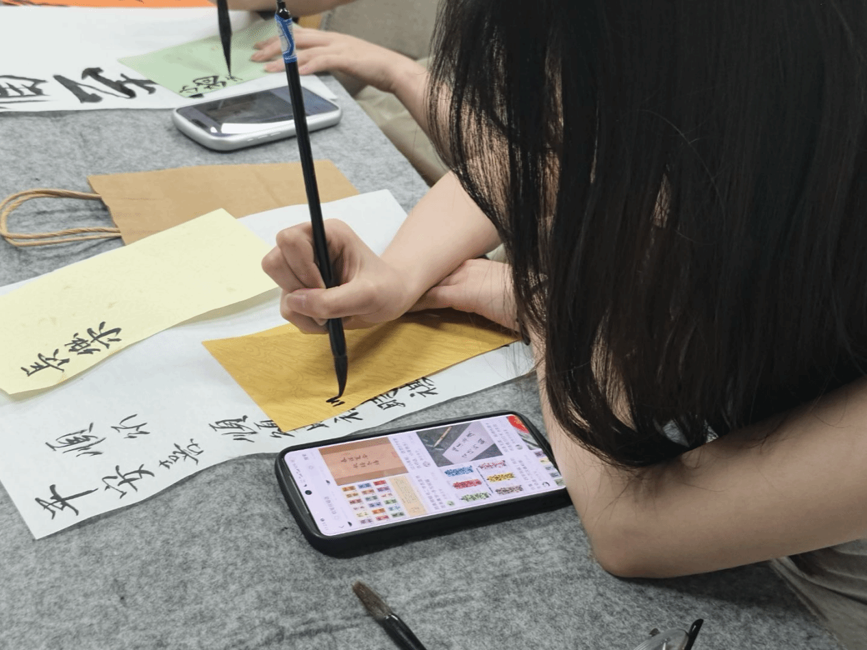 为了让同学们能够创作出满意的作品,工作人员会在旁耐心指导,鼓励大家先在草稿纸上进行练习。同学们纷纷拿起毛笔,认真临摹、反复揣摩,力求掌握笔法的精妙之处。经过一番练习后,大家渐入佳境,便开始在彩纸上正式创作。