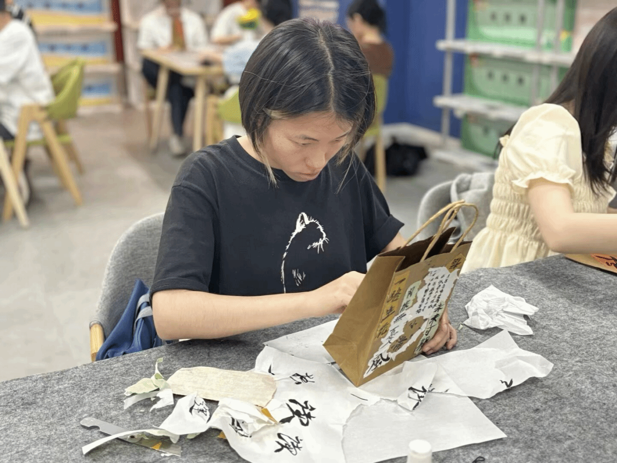 一时间,现场墨香四溢,同学们神情专注,身姿端正。有的同学书写的是经典的古诗词,从李白的豪放洒脱到杜甫的沉郁顿挫,在笔墨间感受古人的诗意情怀;有的同学则选择书写励志的名言警句,激励自己在未来的学习和生活中勇往直前、积极向上。完成书写后,同学们发挥创意,将书法彩纸按照自己的构思拼接在宣纸上,有的拼成了书卷模样,象征对知识的不懈追求,创意与墨香齐飞,文化共青春一色。