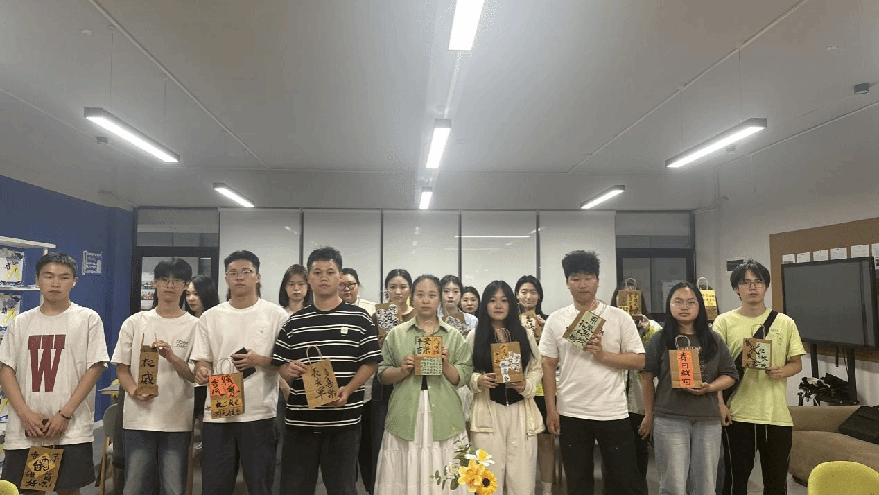 当创作接近尾声,工作人员提醒同学们抓紧时间完善作品。一切就绪后,全体参与者和工作人员,进行集体拍照留念。相机快门按下的那一刻,同学们灿烂的笑容与手中凝聚着心血的书法彩纸作品一同被定格,成为了此次活动中最美好的画面。
