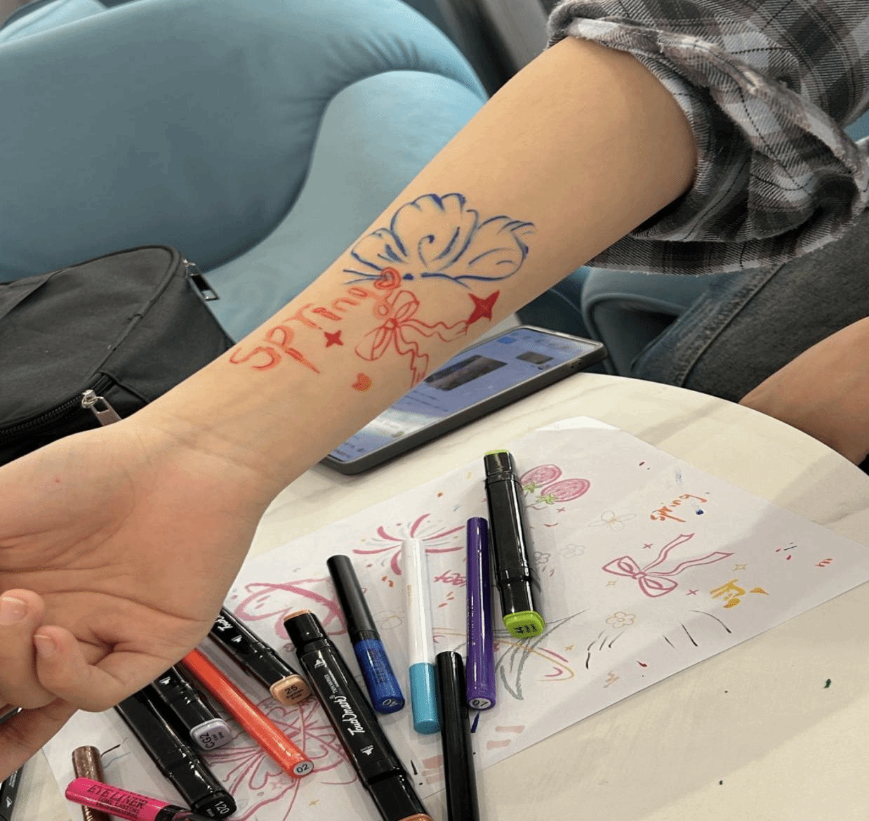 活动以“春之印记”为主题,将面部彩绘与花卉“纹身”相结合,旨在通过艺术创作传递春天的生机与活力。参与者可选择在面部、手臂等部位绘制自然植物、动物或春日意象图案。活动现场提供了丰富的彩绘模板,同时鼓励自由创作,充分激发了学生的想象力与创造力。彩绘过程中,同学们或专注设计个人作品,或互相协作完成绘制,现场氛围轻松而热烈。