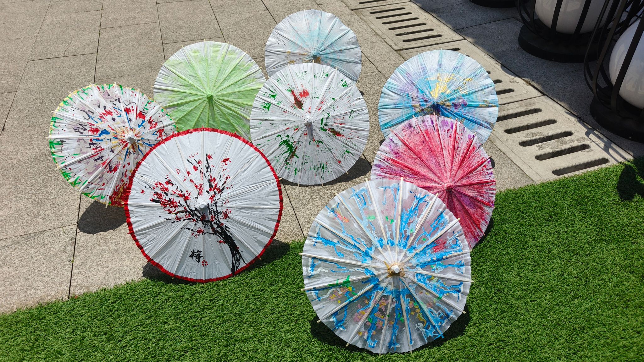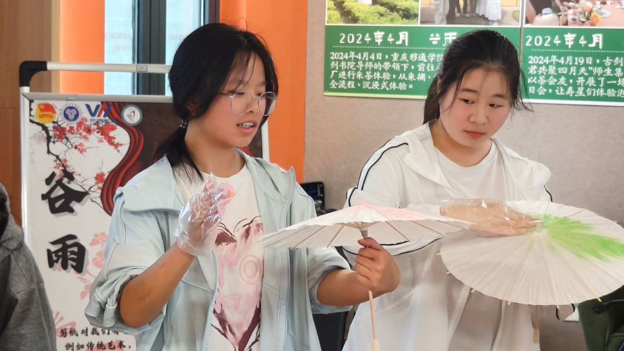 非遗体验环节是活动的核心亮点。同学们尽情发挥创意与才华,相互欣赏艺作品,彼此的艺术灵魂碰撞出多姿的火花;古风彩绘区域,空白的团扇和油纸伞成为创意画布,同学们手持画笔,精心勾勒,将自己对美的理解与对谷雨节气的感悟倾注于色彩之中。有的描绘出春日繁花盛开的盛景,有的勾勒出烟雨朦胧的诗意画面,每一幅作品都展现出独特的艺术魅力。